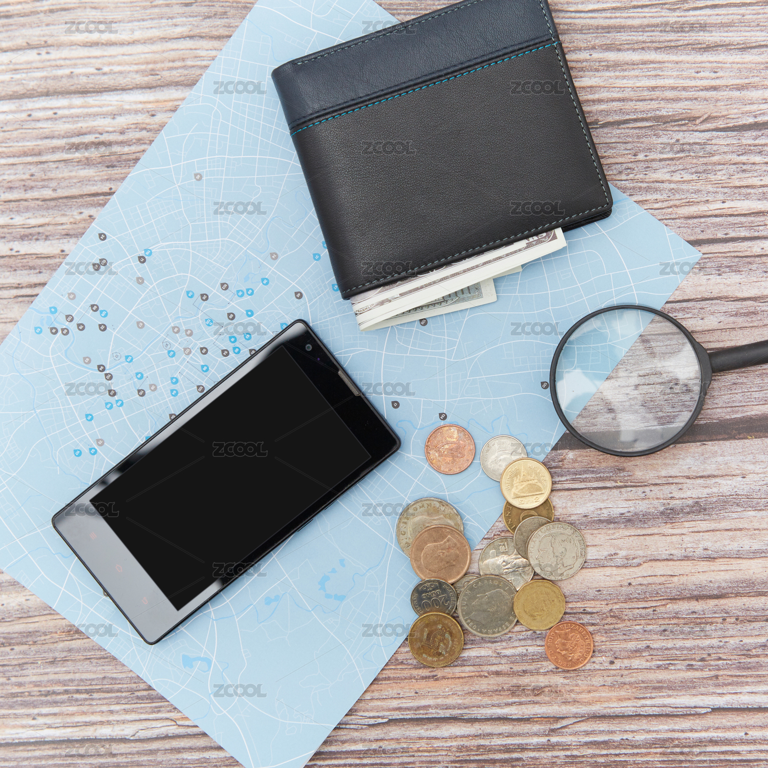 在地图上的旅行用品