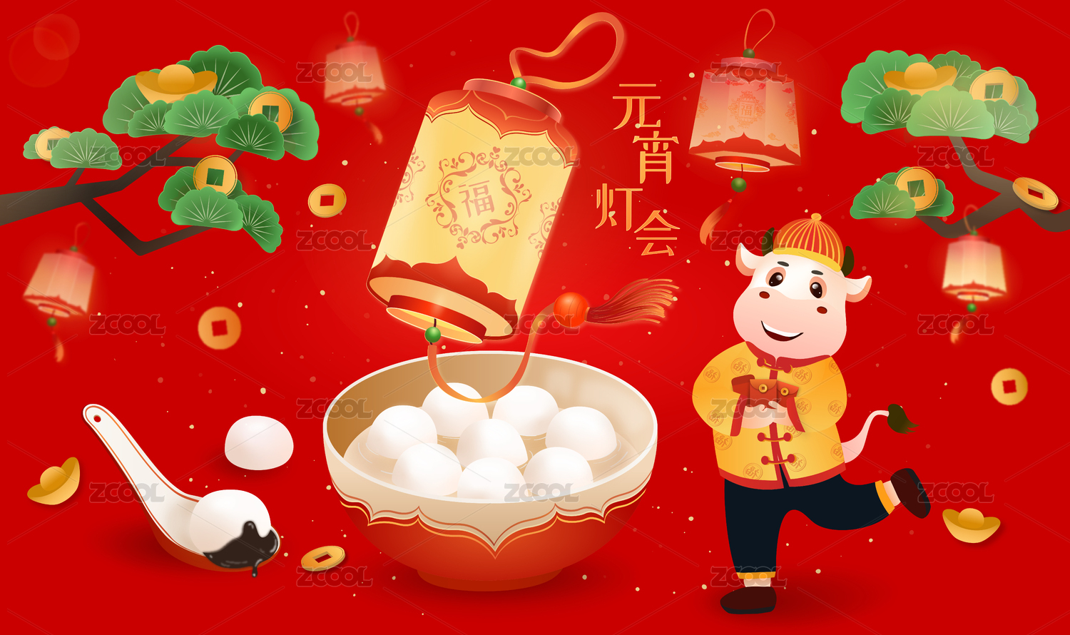 元宵灯会牛年吃汤圆庆祝正月十五矢量海报