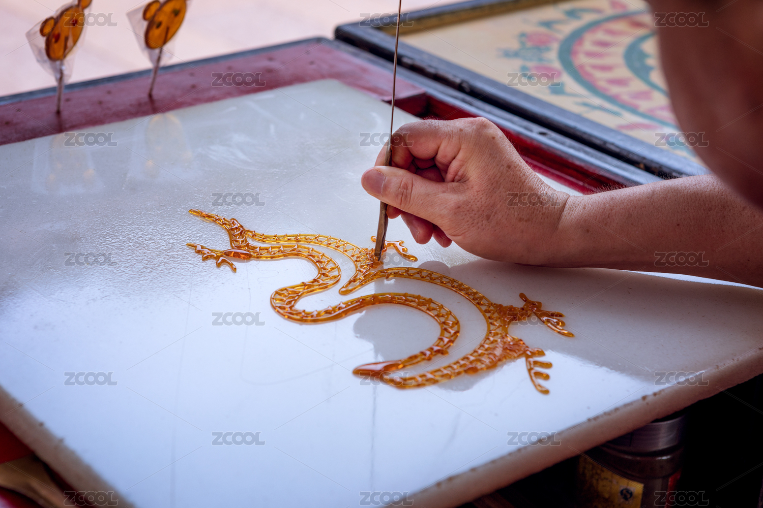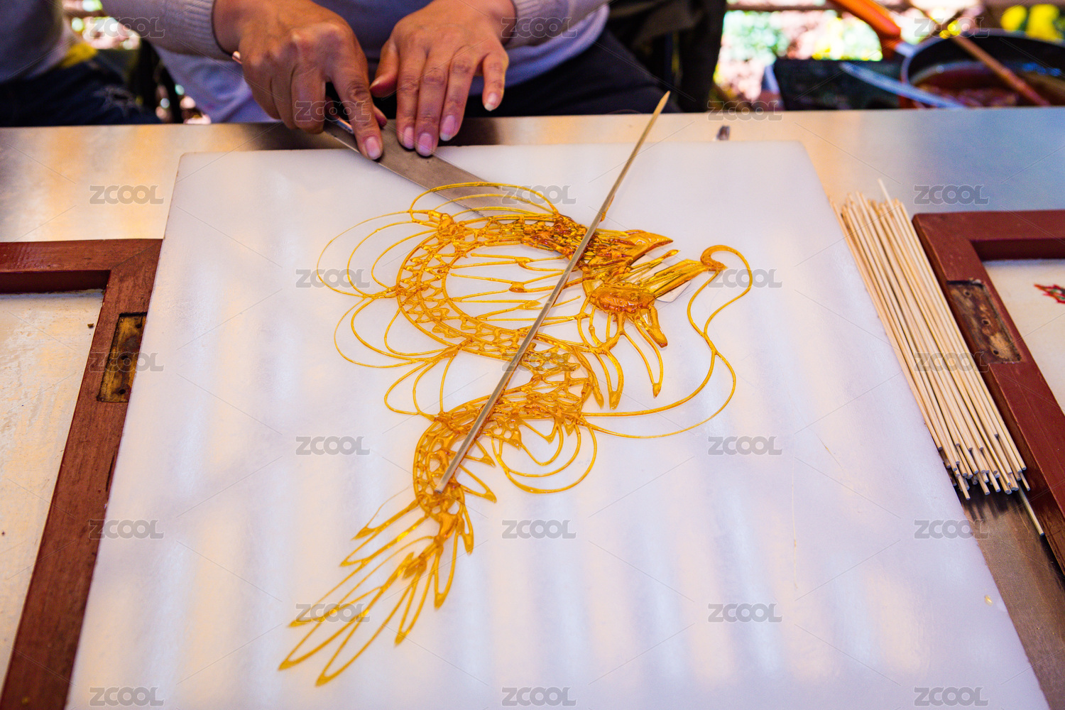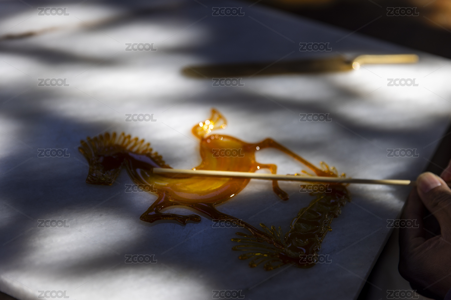 正在白色汉白玉石板上用铁勺乘黄色糖汁绘制的中国民间传统糖画
