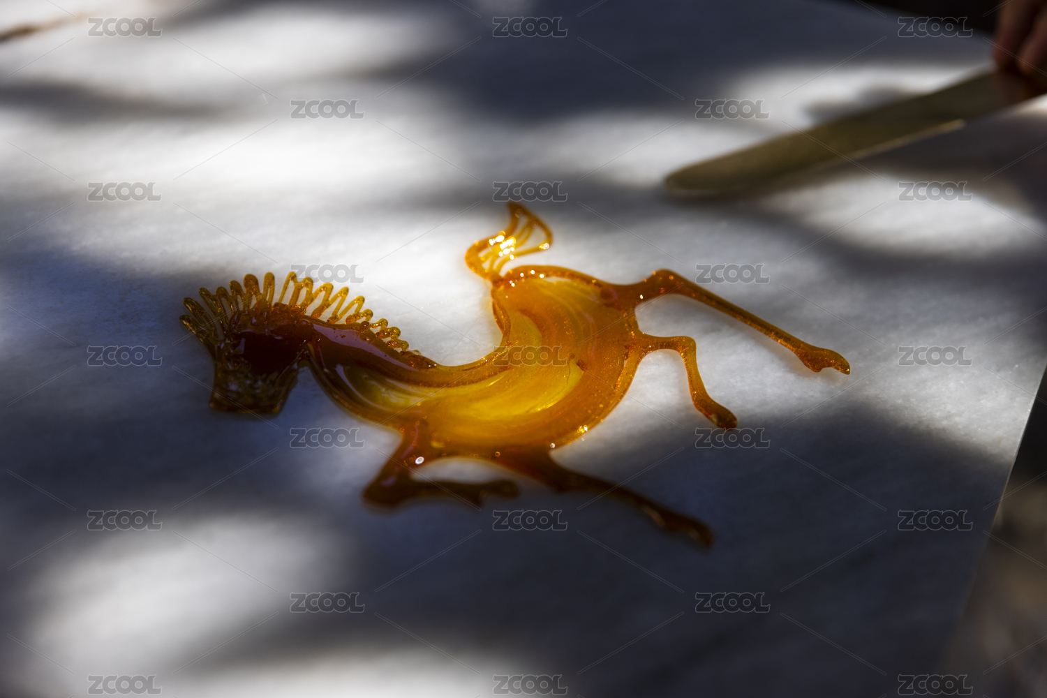 白色汉白玉石板上用黄色糖汁制作的中国民间传统糖画
