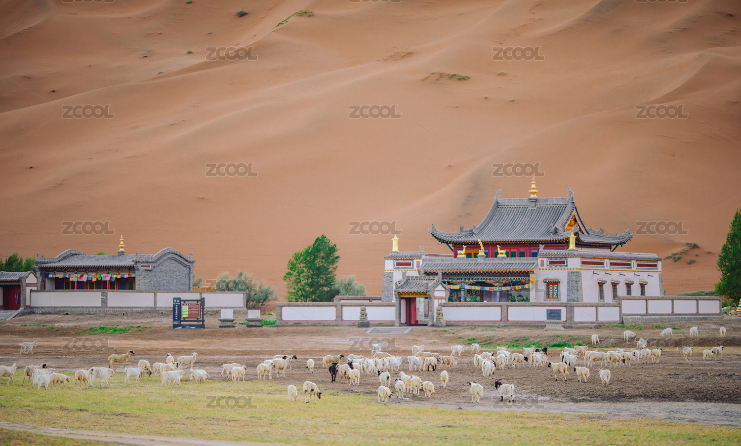 中国内蒙古巴丹吉林沙漠寺庙前的羊群