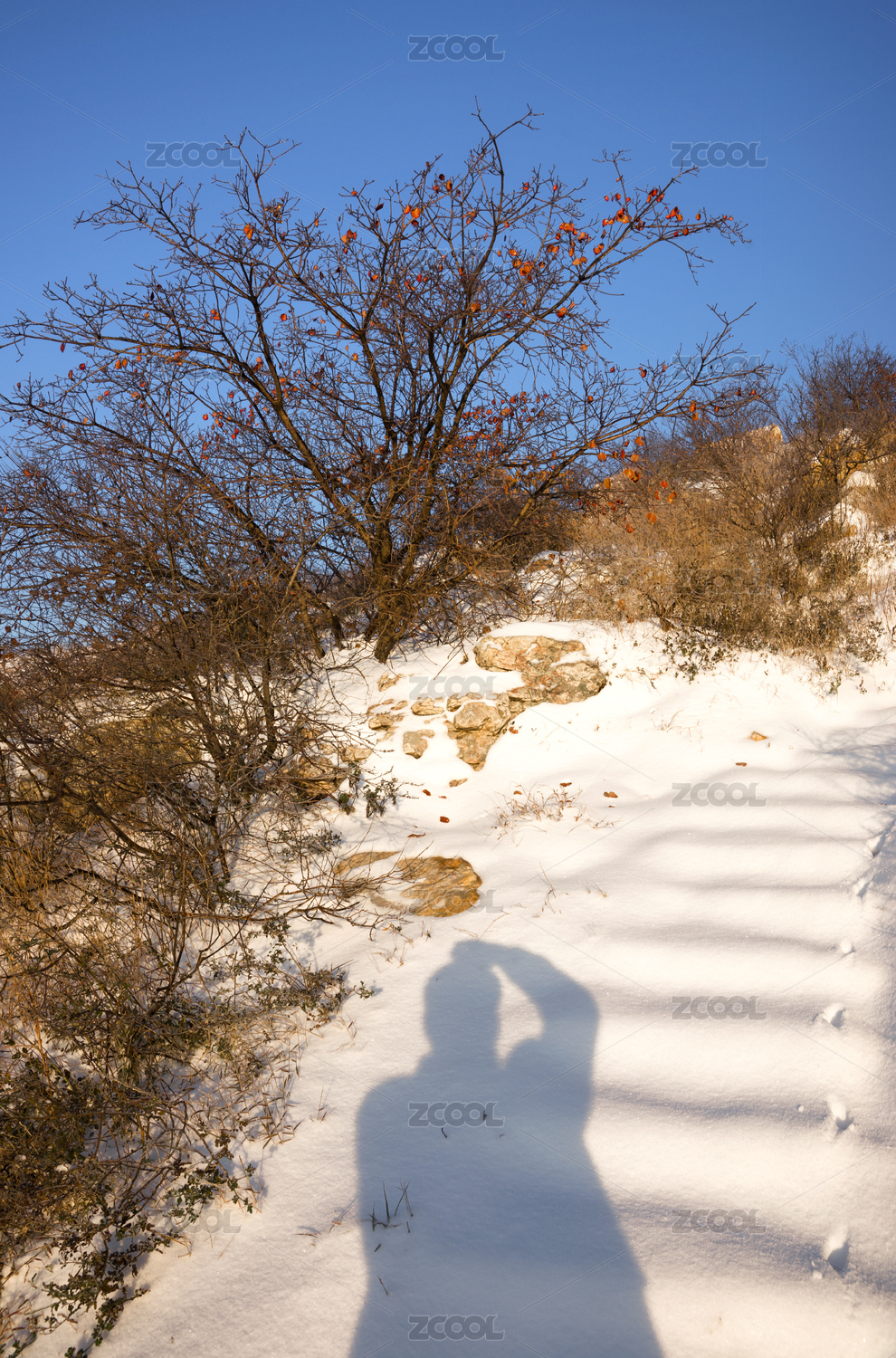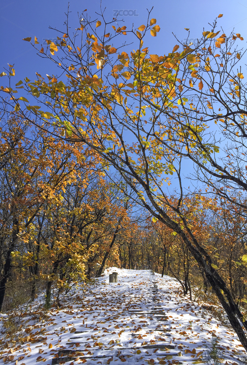中国河南禹州大鸿寨初冬红叶落在雪上