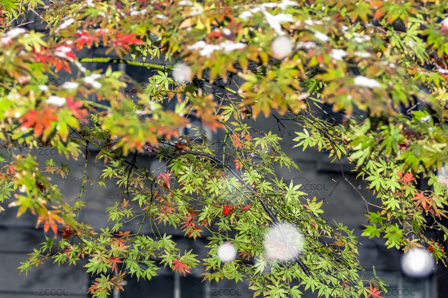 初雪中的枫叶特写