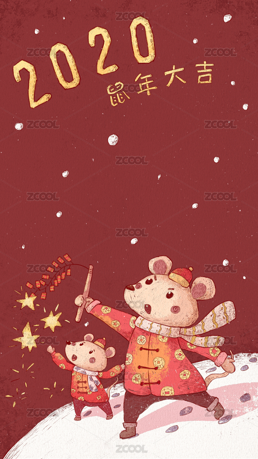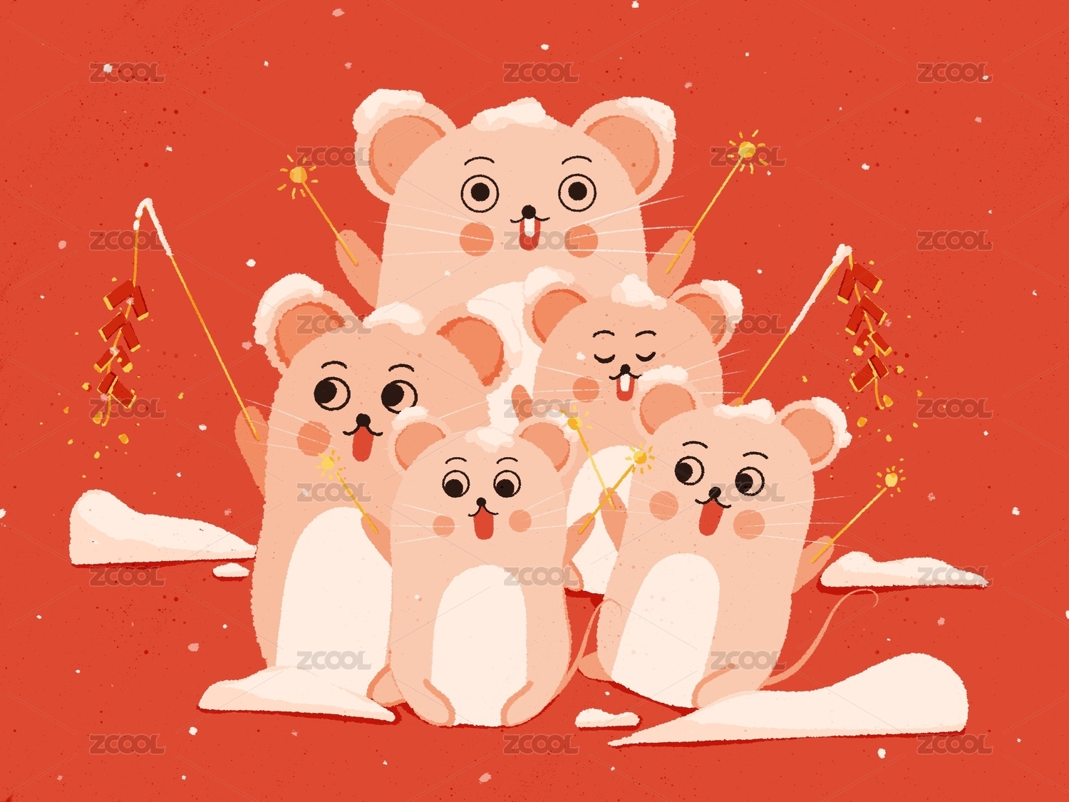 2020鼠年插画贺岁喜庆红色老鼠新年春节过年鞭炮