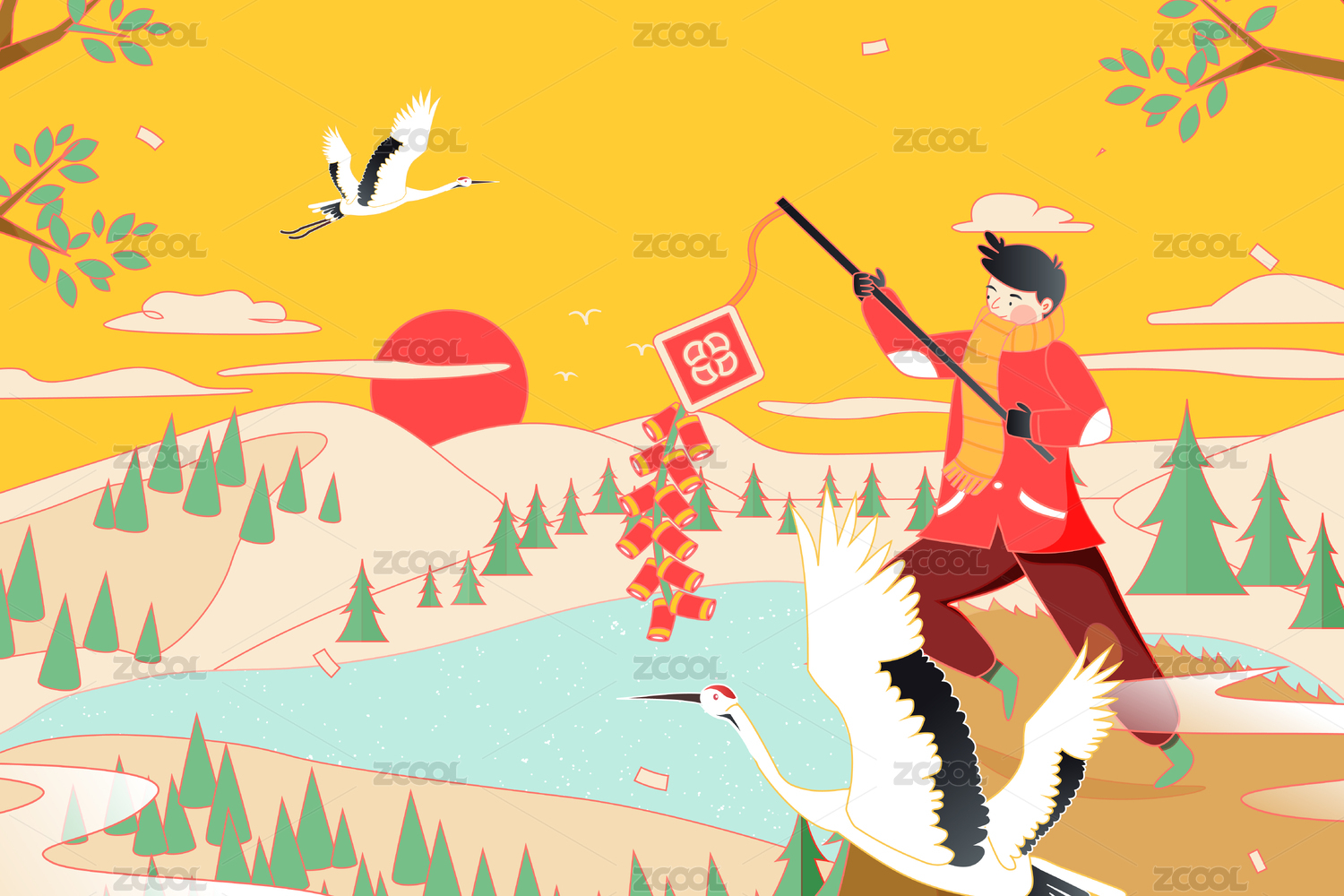 卡通新年国潮仙鹤春节放鞭炮背景矢量插画