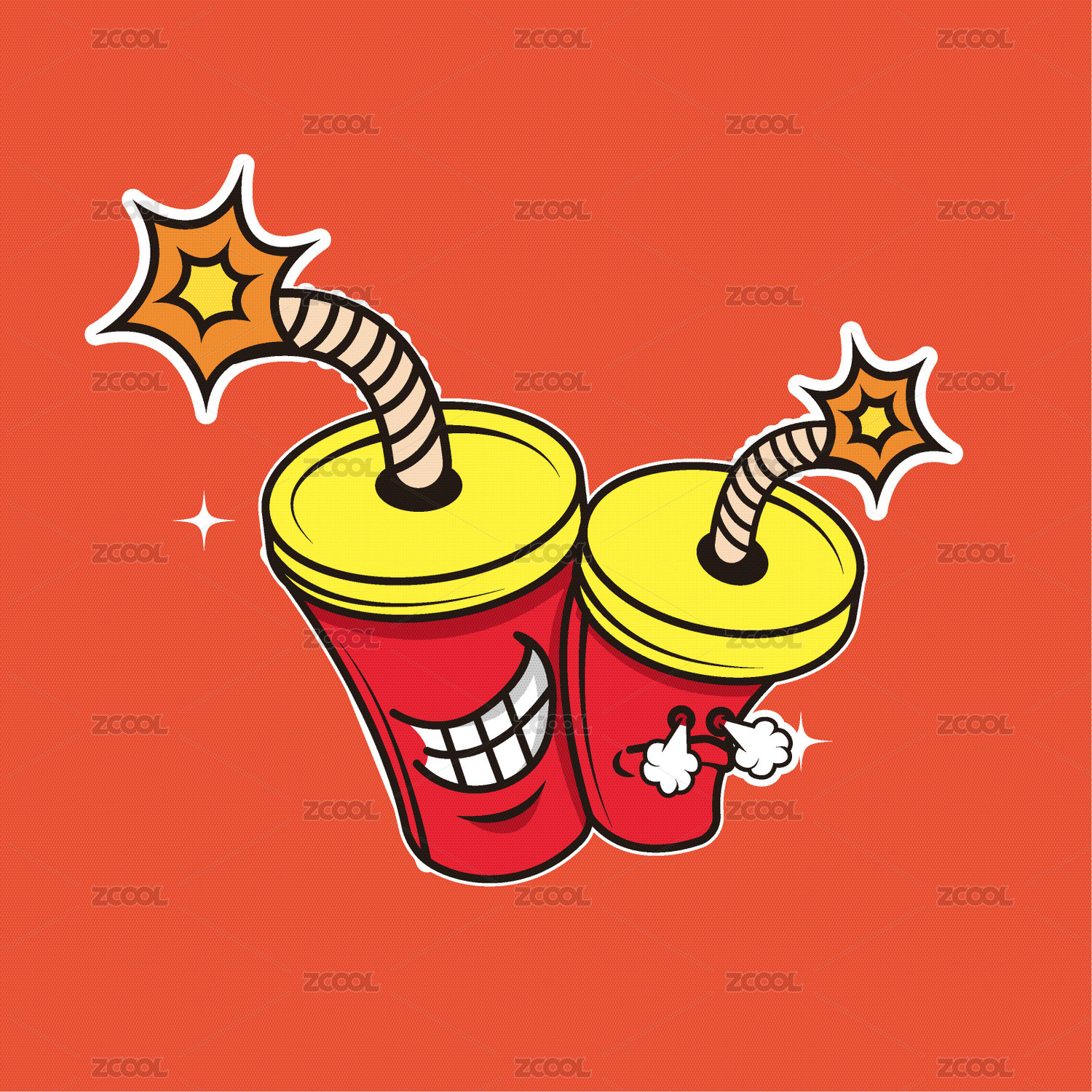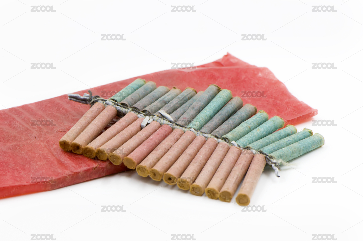 红色背景上两串3D立体鞭炮或炮仗,燃放着的鞭炮和爆竹