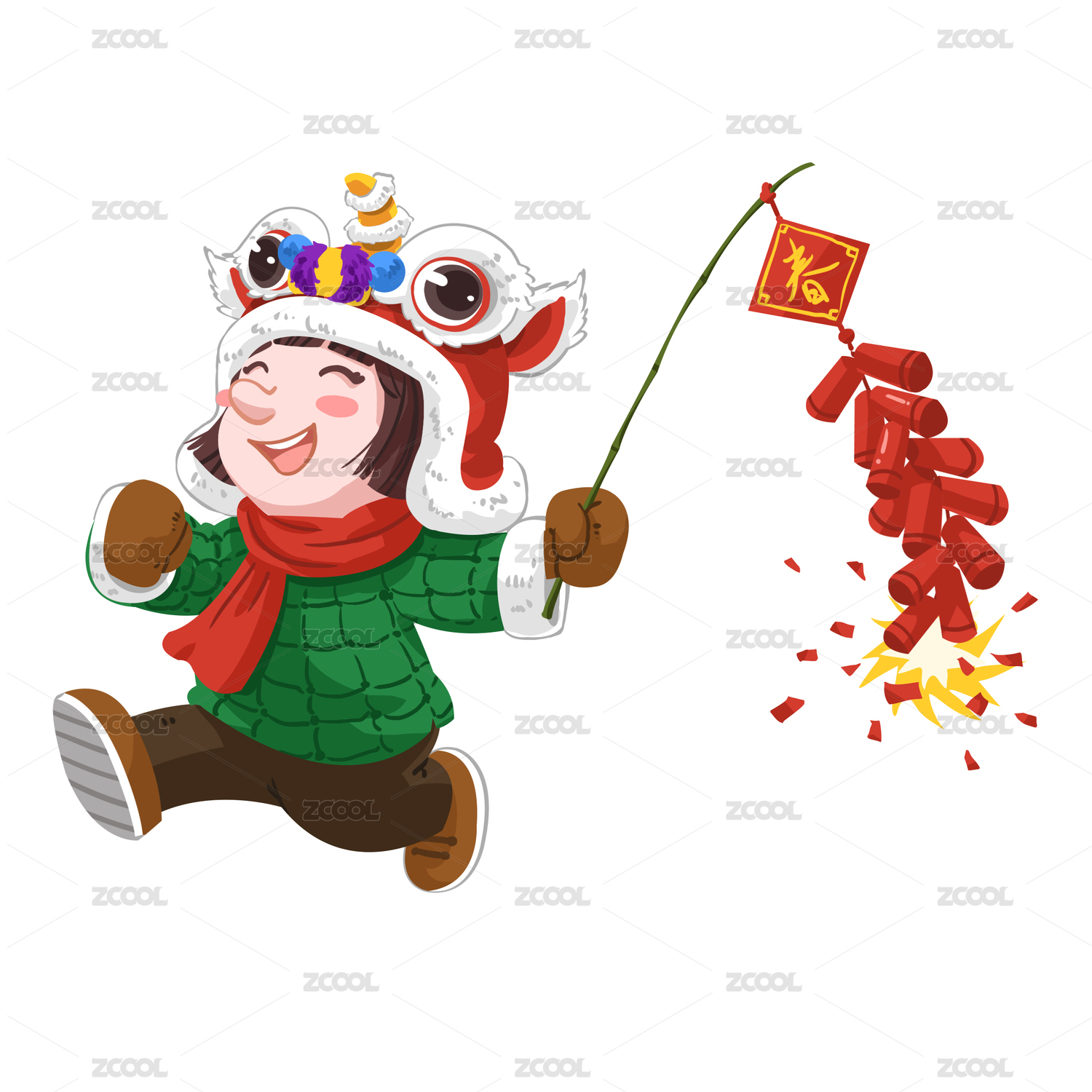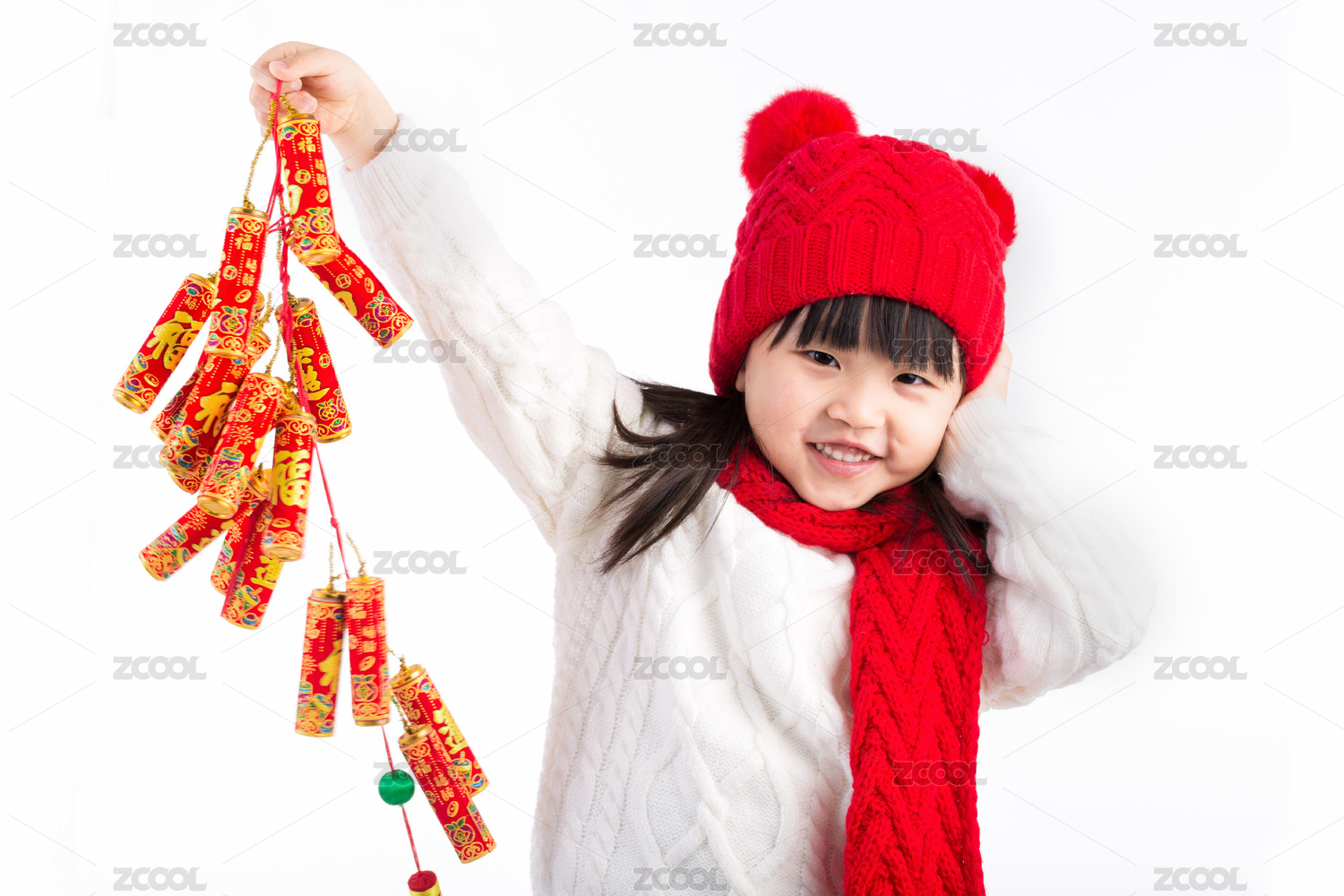 带红帽的小女孩一手捂耳朵一手提鞭炮