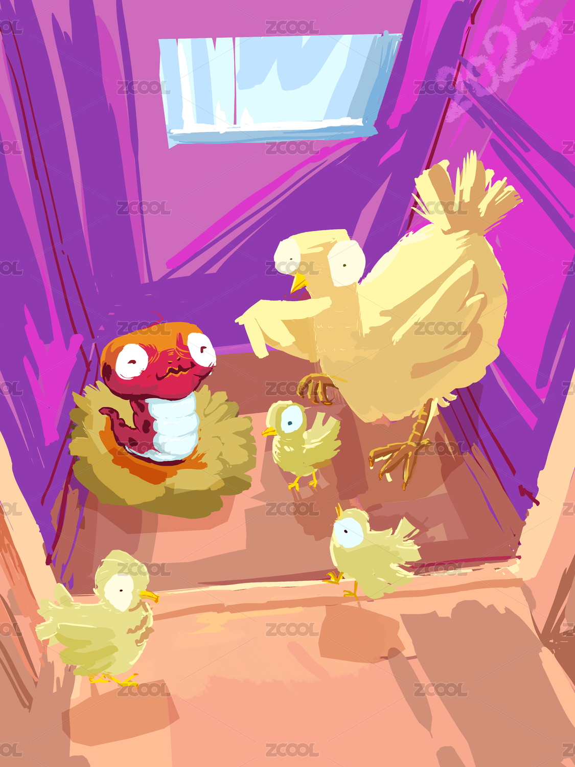 小鸡和一只老母鸡围绕着一条小蛇-儿童插画