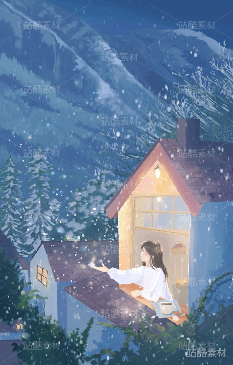 扁平风格圣诞节系列故事风景插画之女孩在屋里