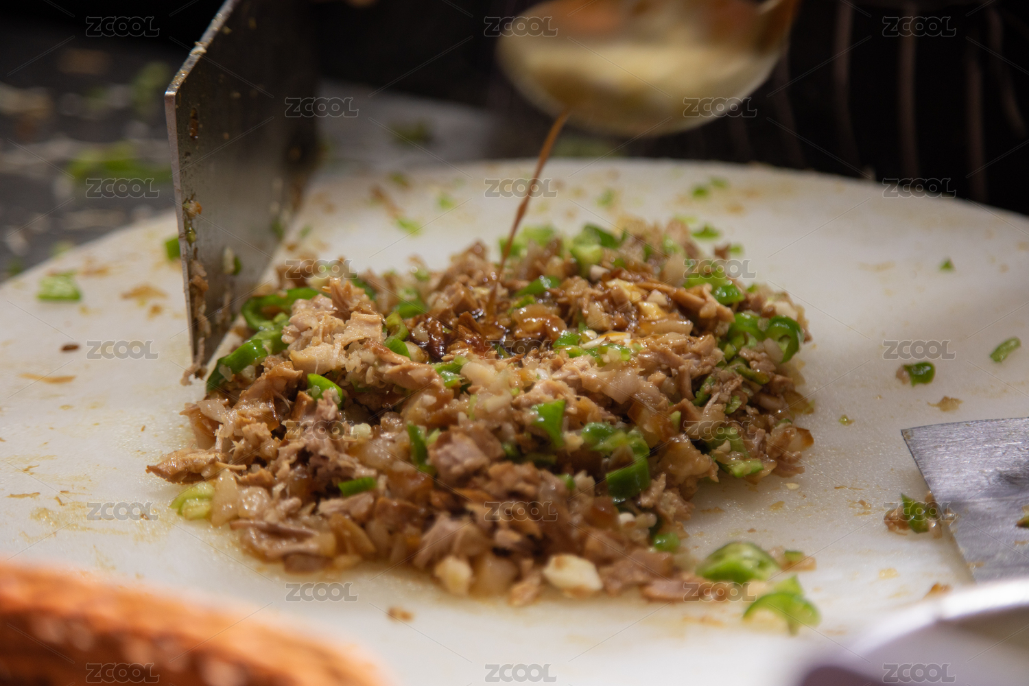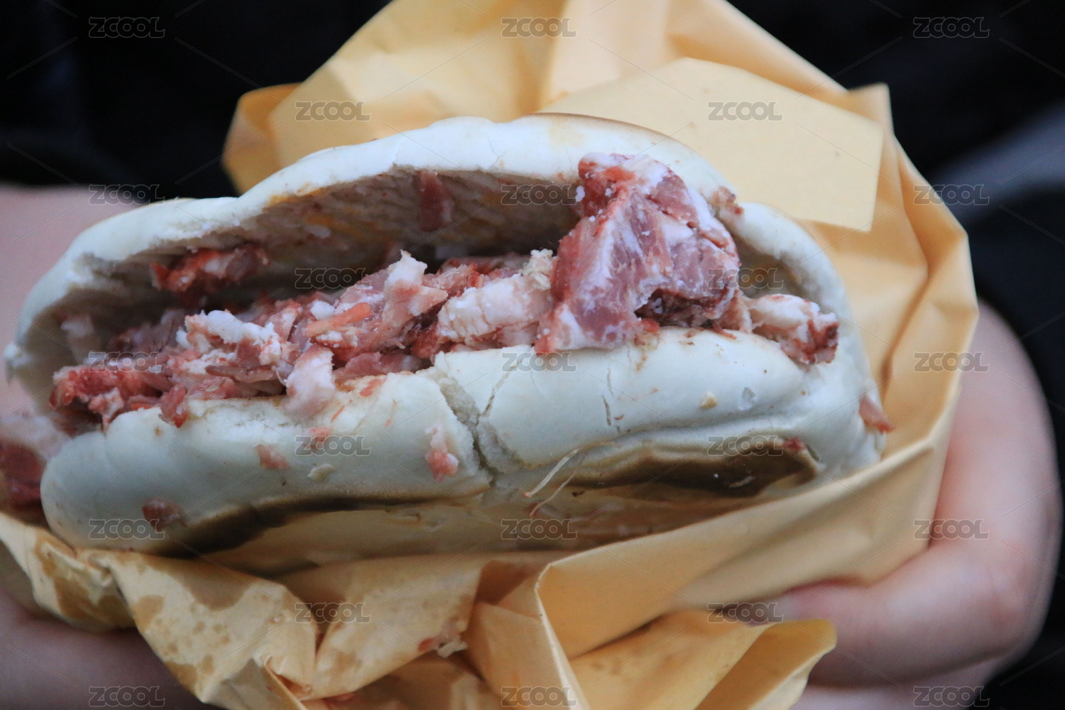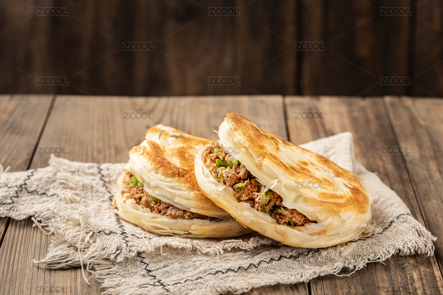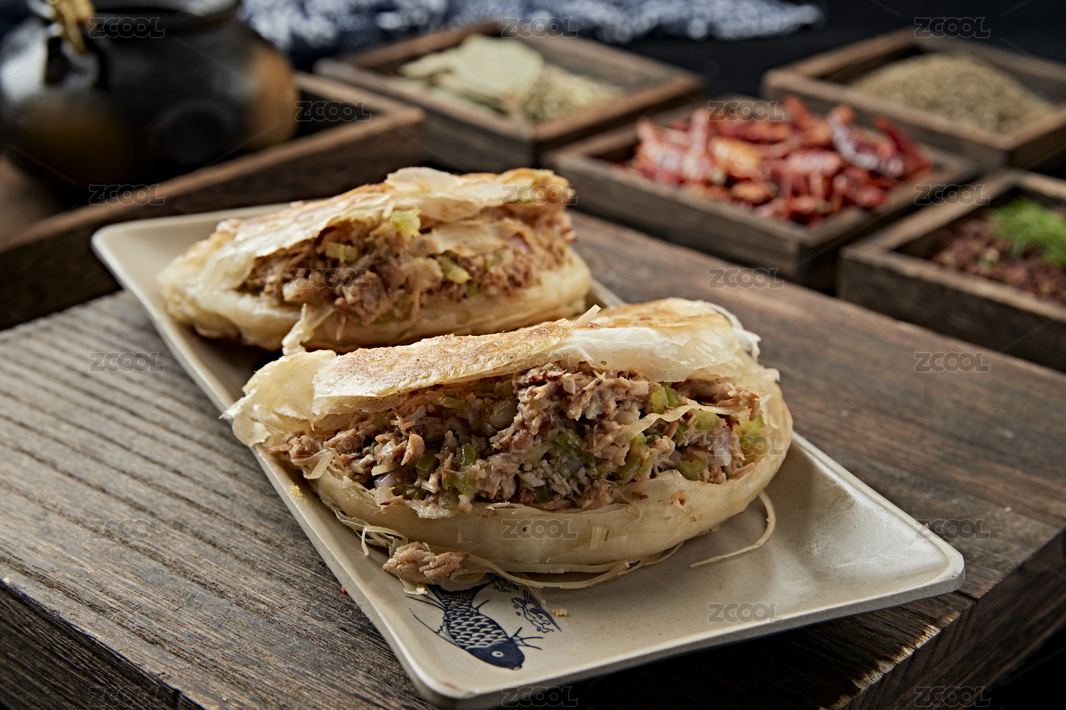大理石背景垫子上的西安肉夹馍虾肉夹馍