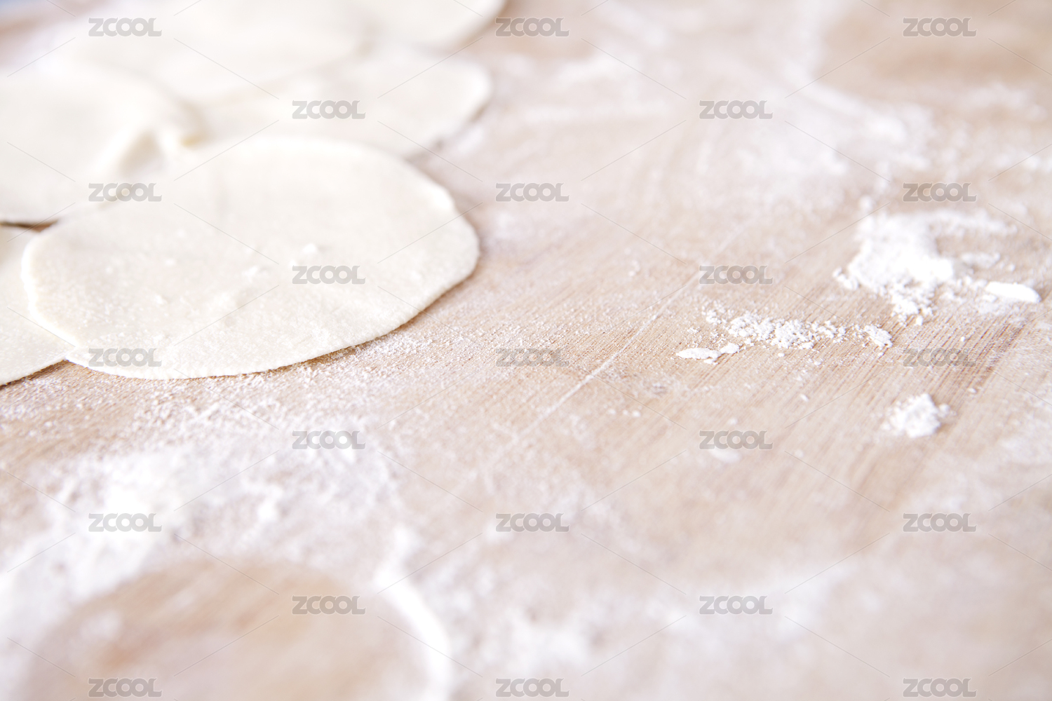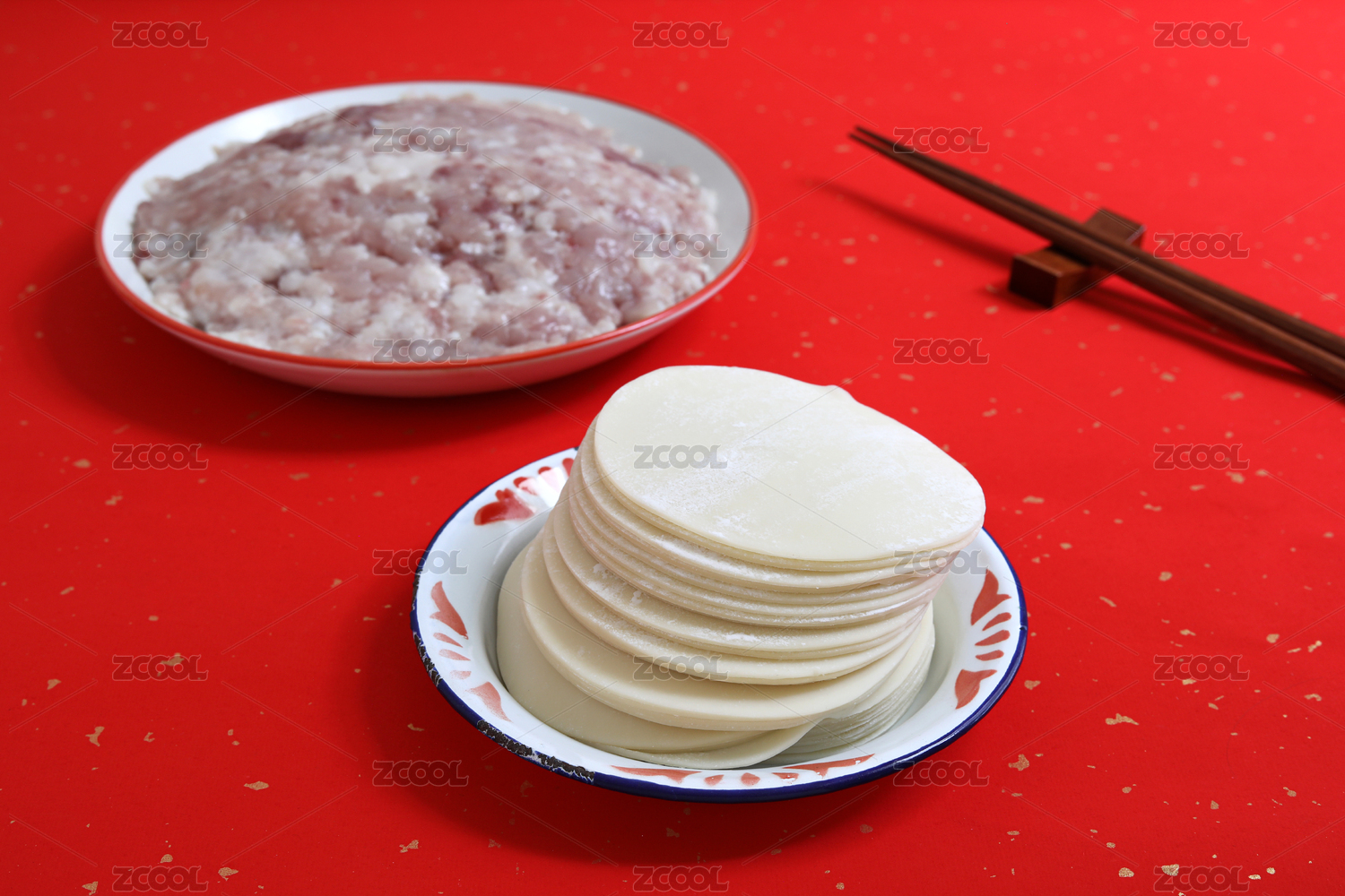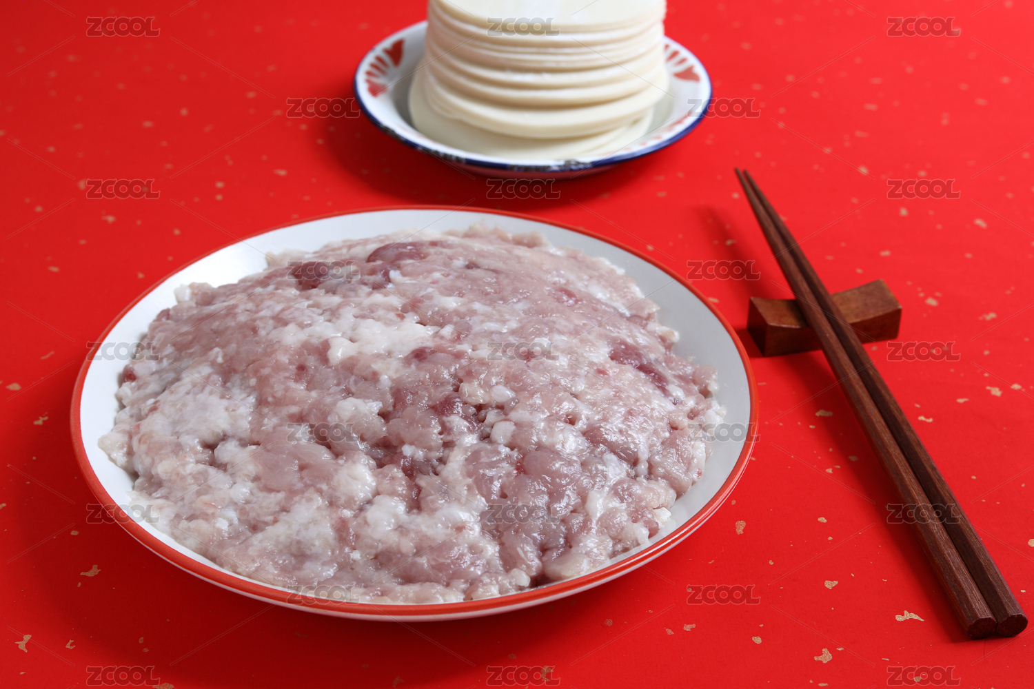 红色桌面上的春节年夜饭食材饺子馅和饺子皮