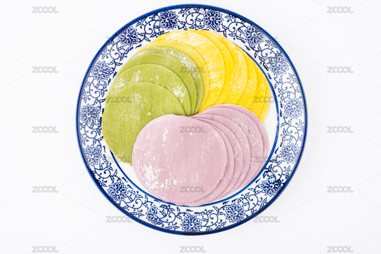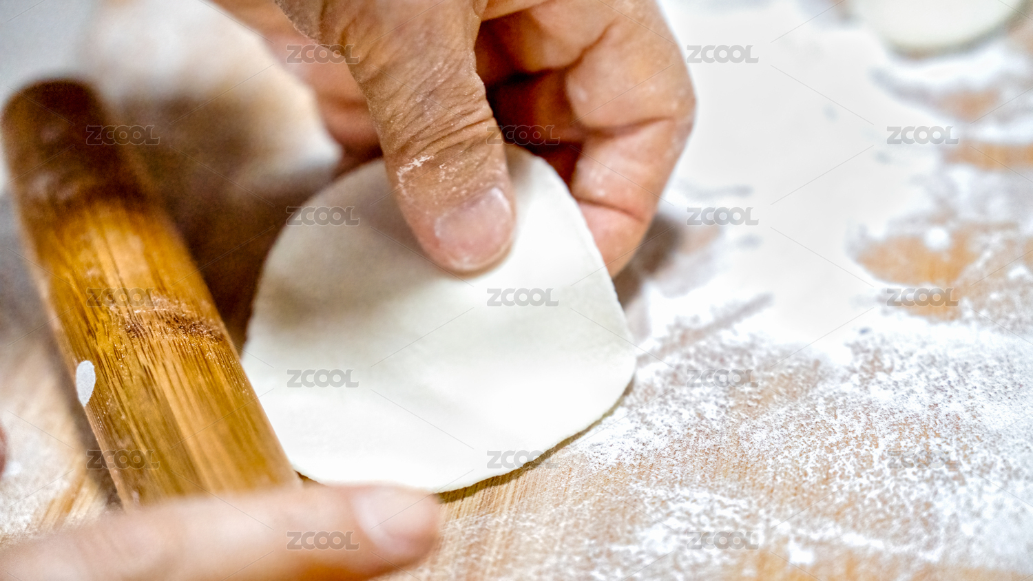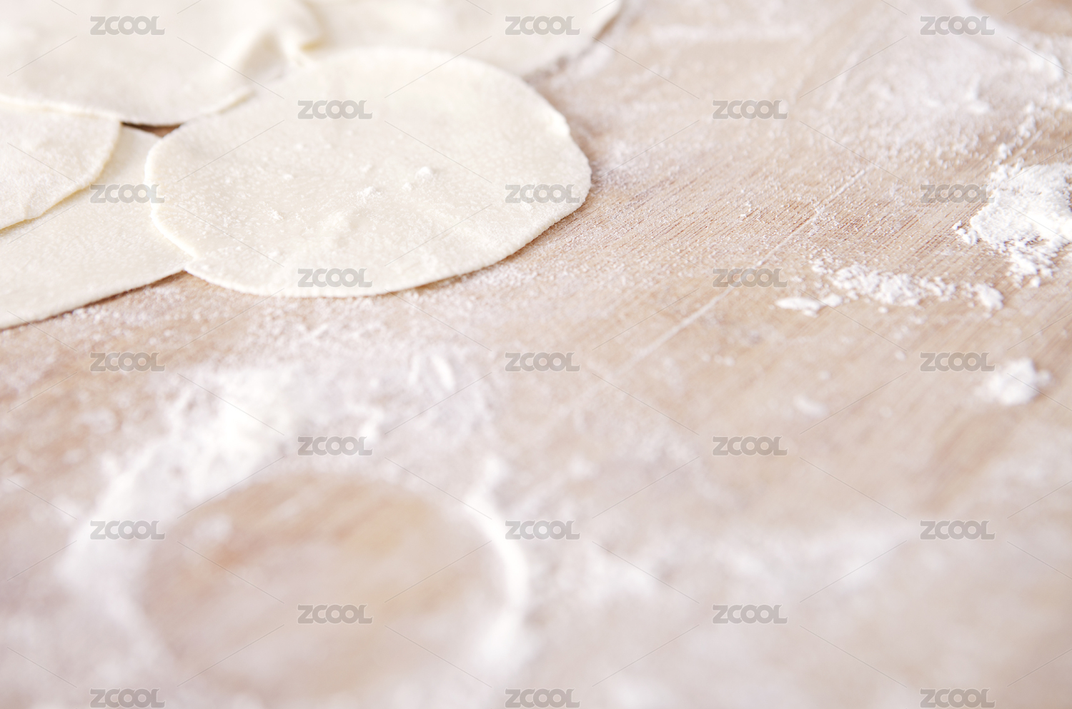 红色桌面上的春节年夜饭食材饺子馅和饺子皮