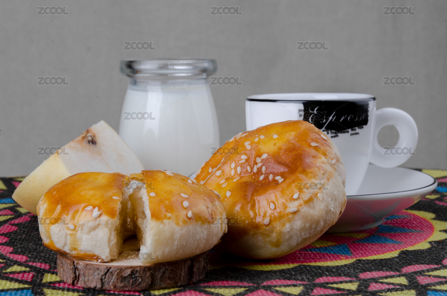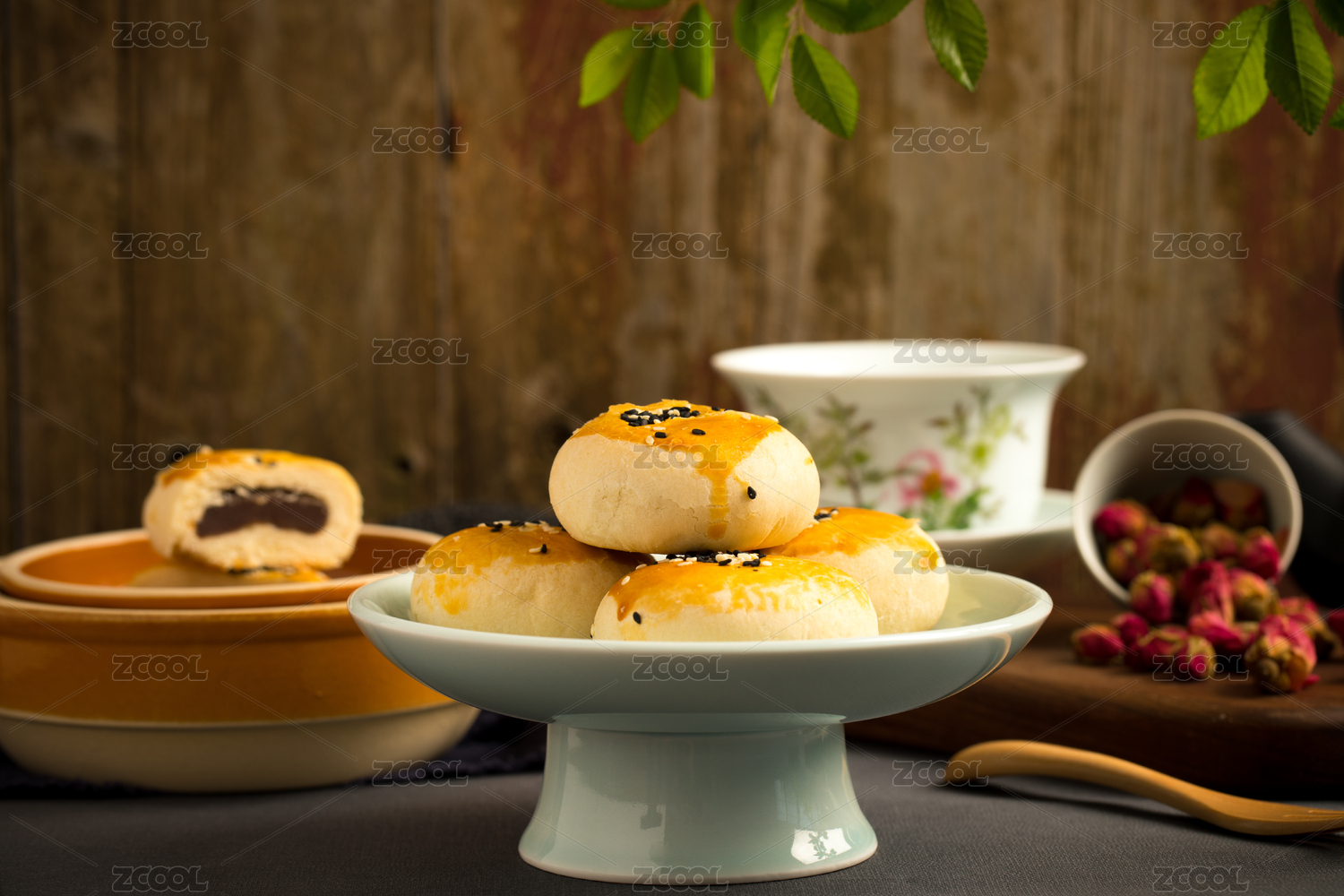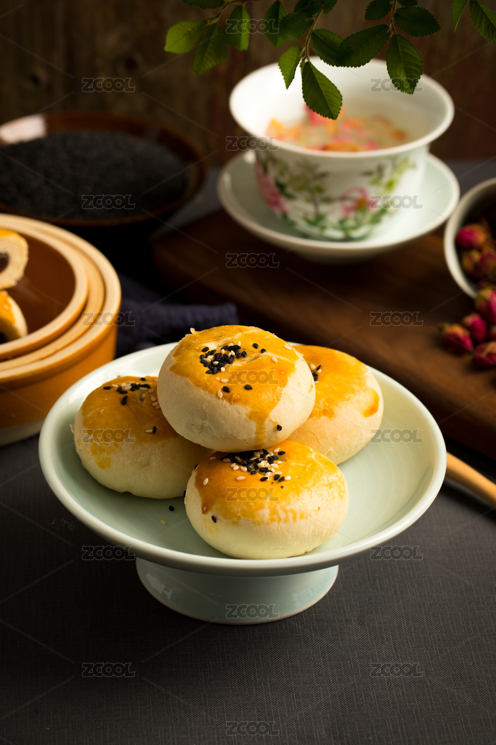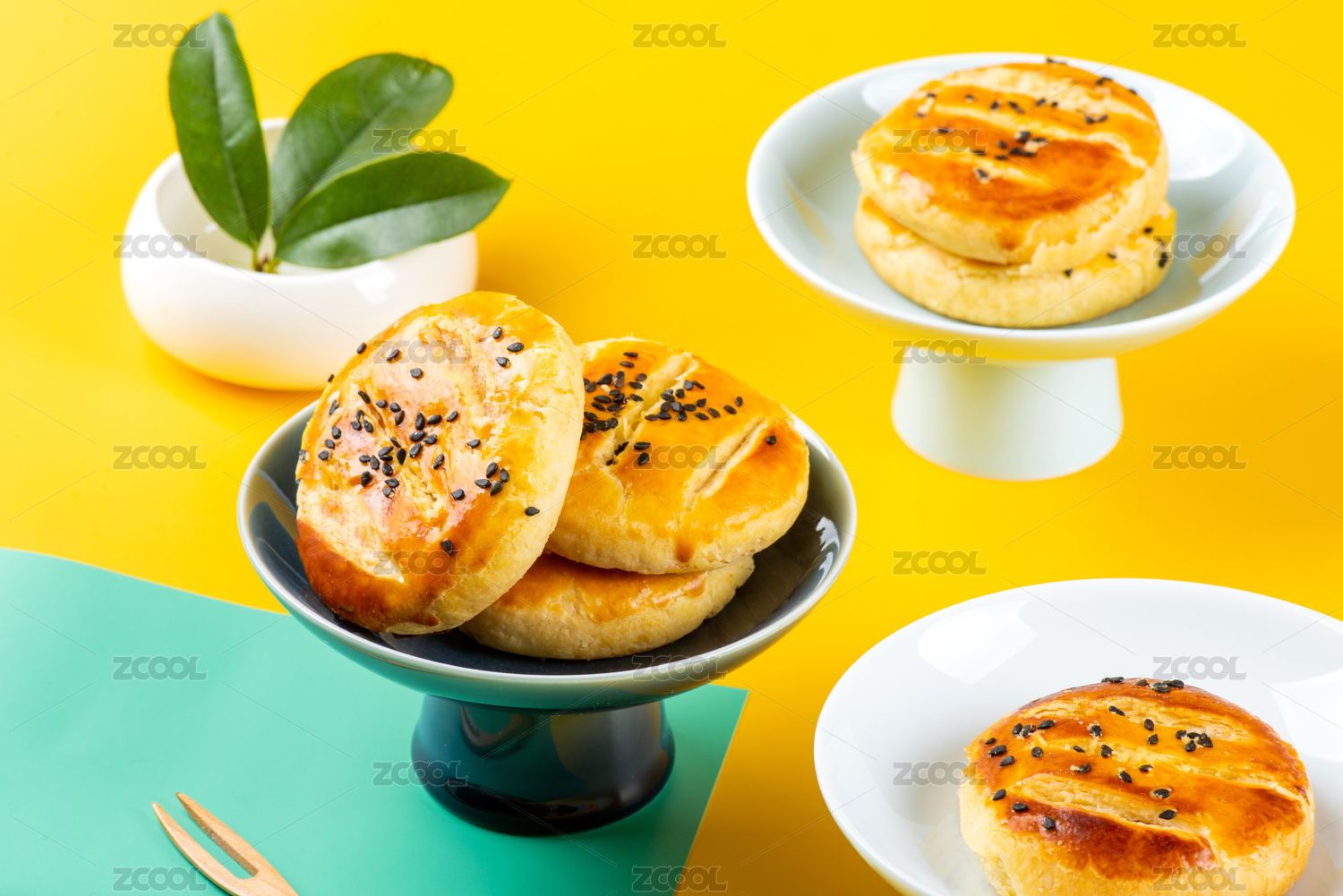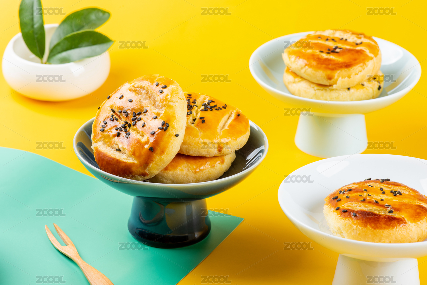 明亮鲜艳底色上的高脚盘装老婆饼