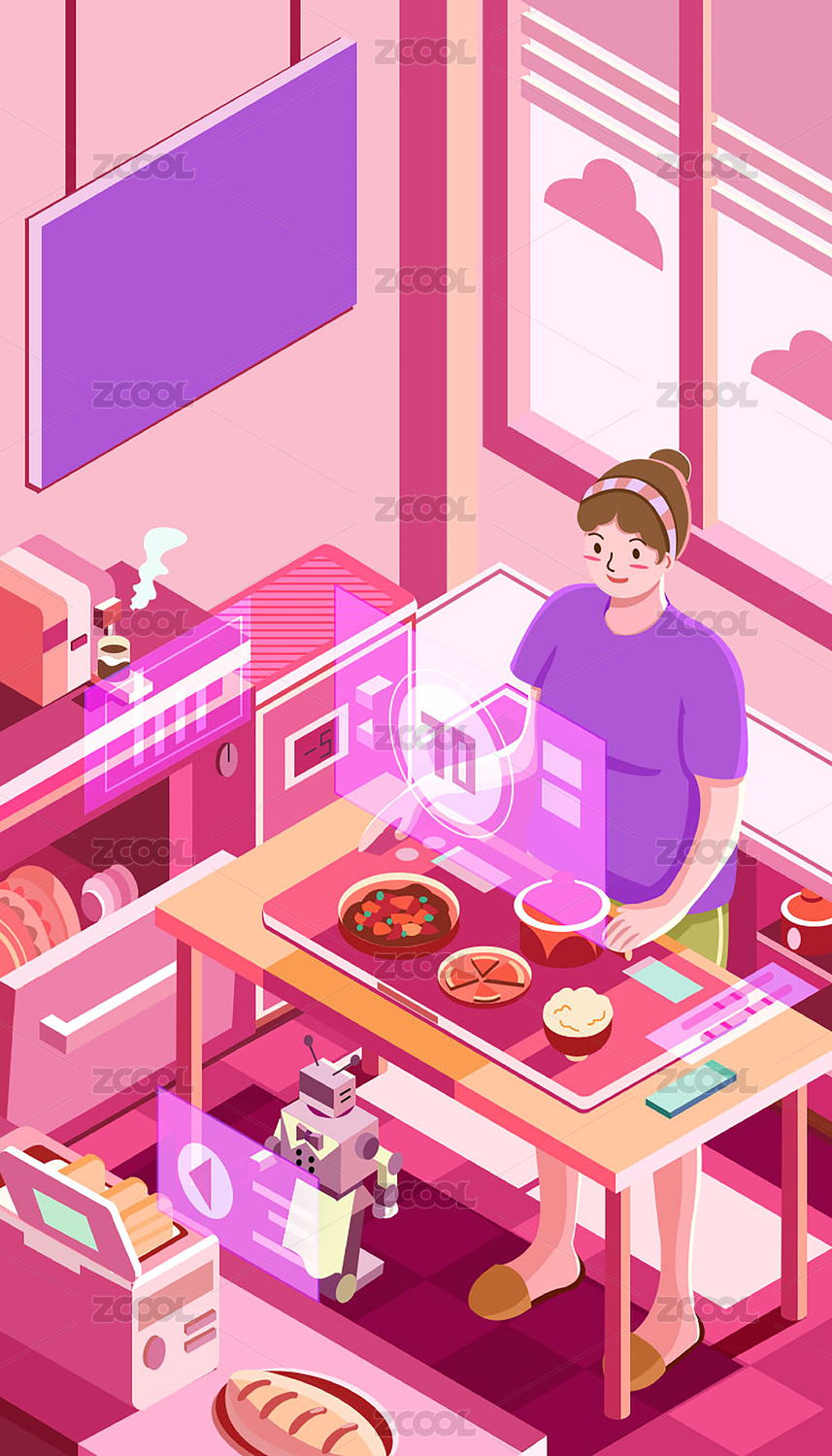 在厨房使用智慧家电的女孩