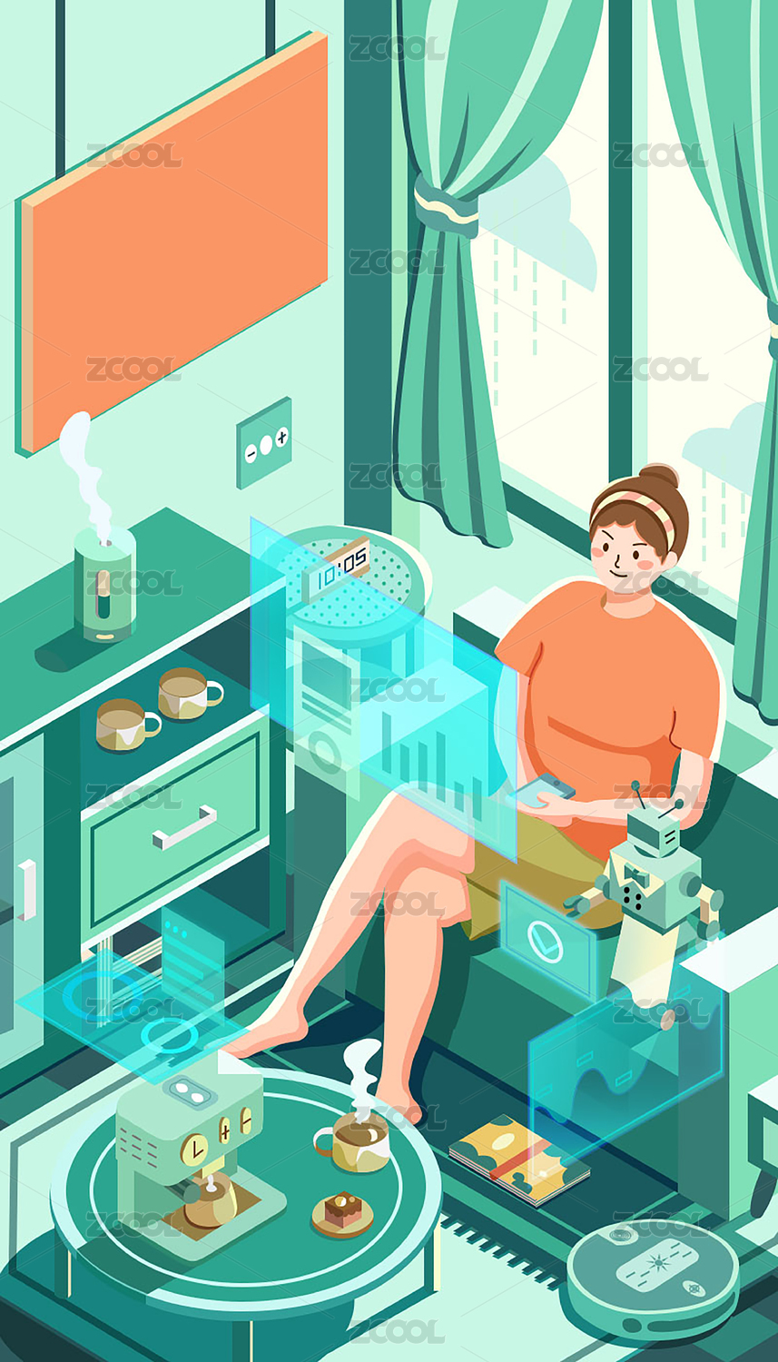 在客厅使用智能家电的女孩