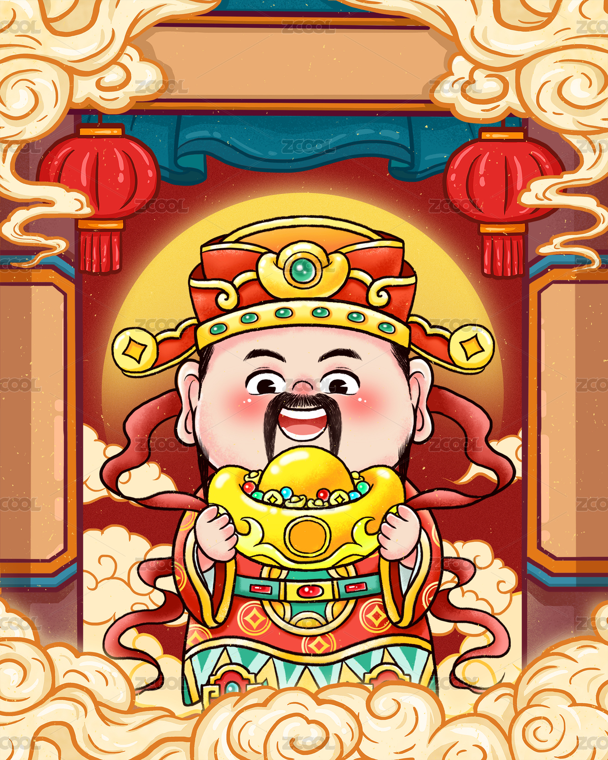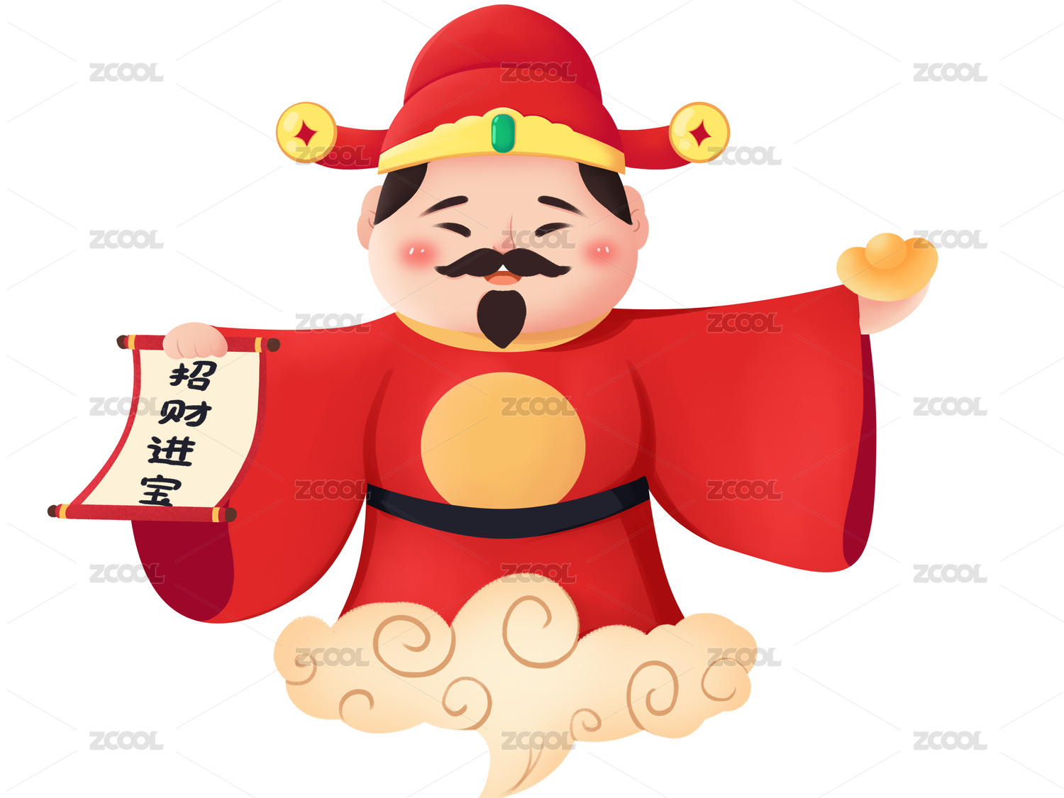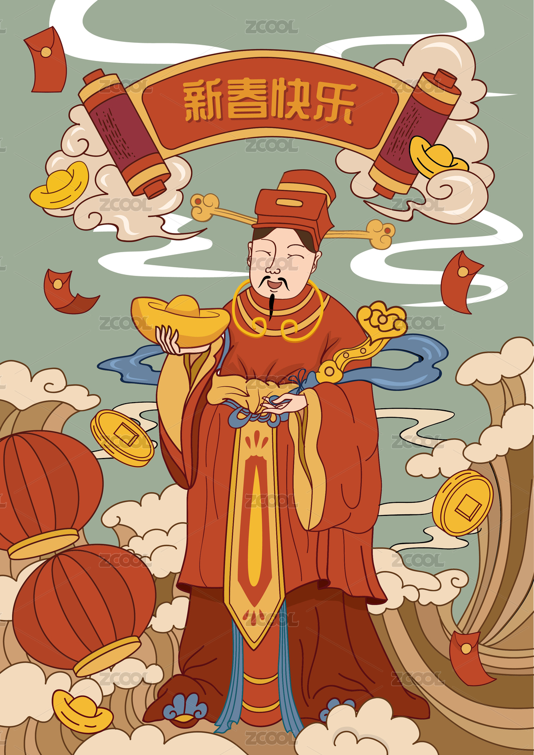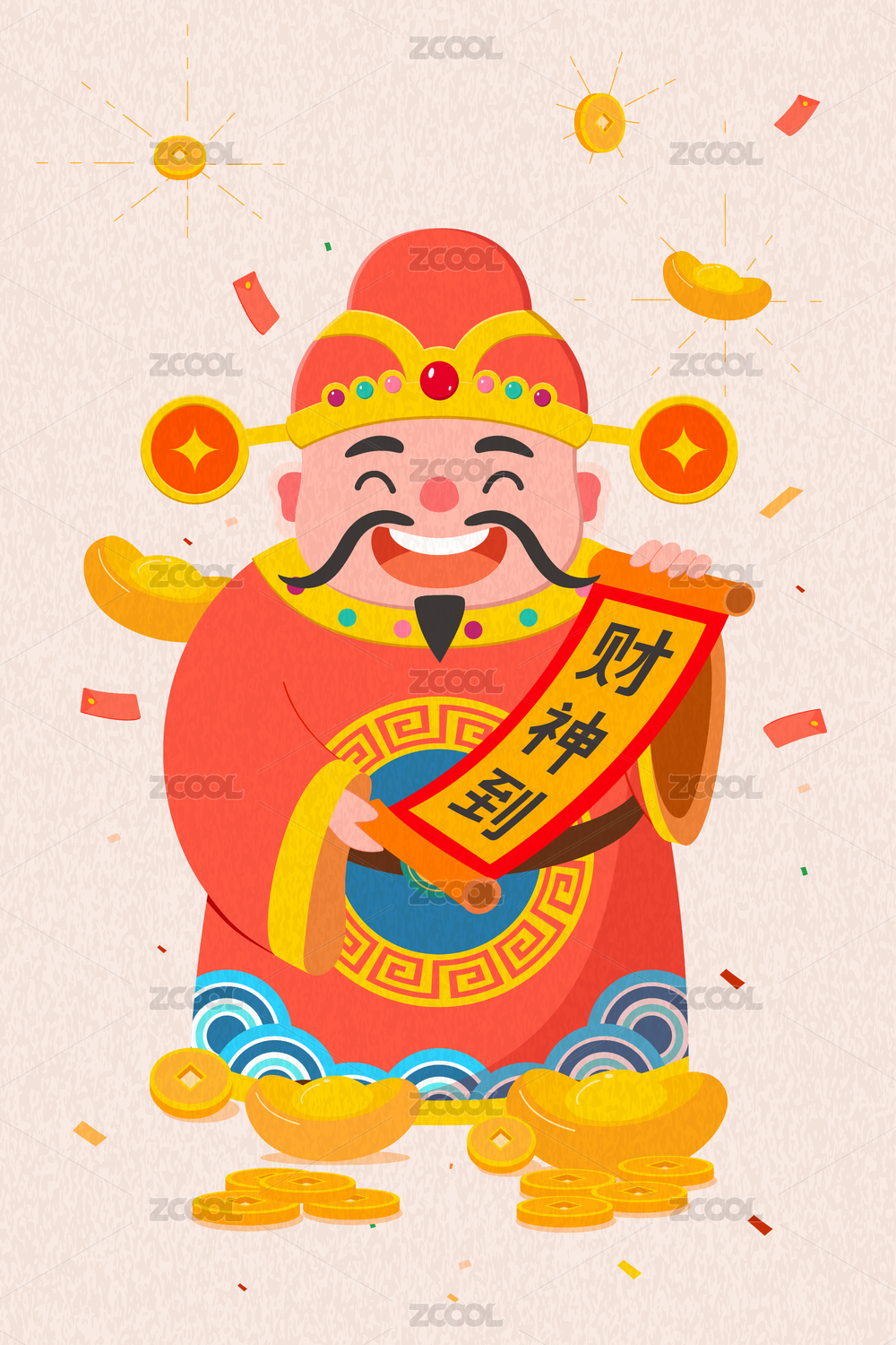 红色喜庆手绘国潮财神爷祝贺新春快乐插画