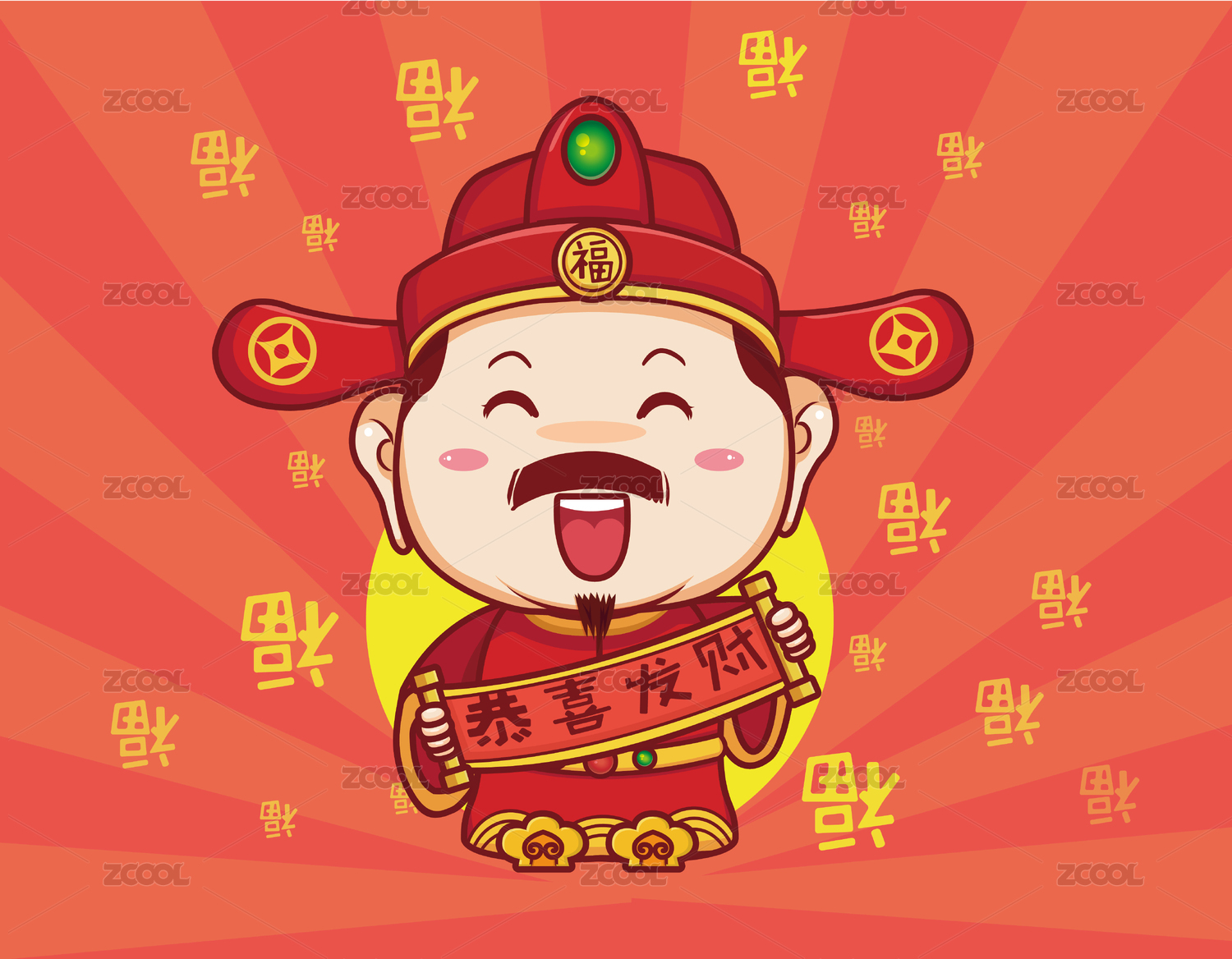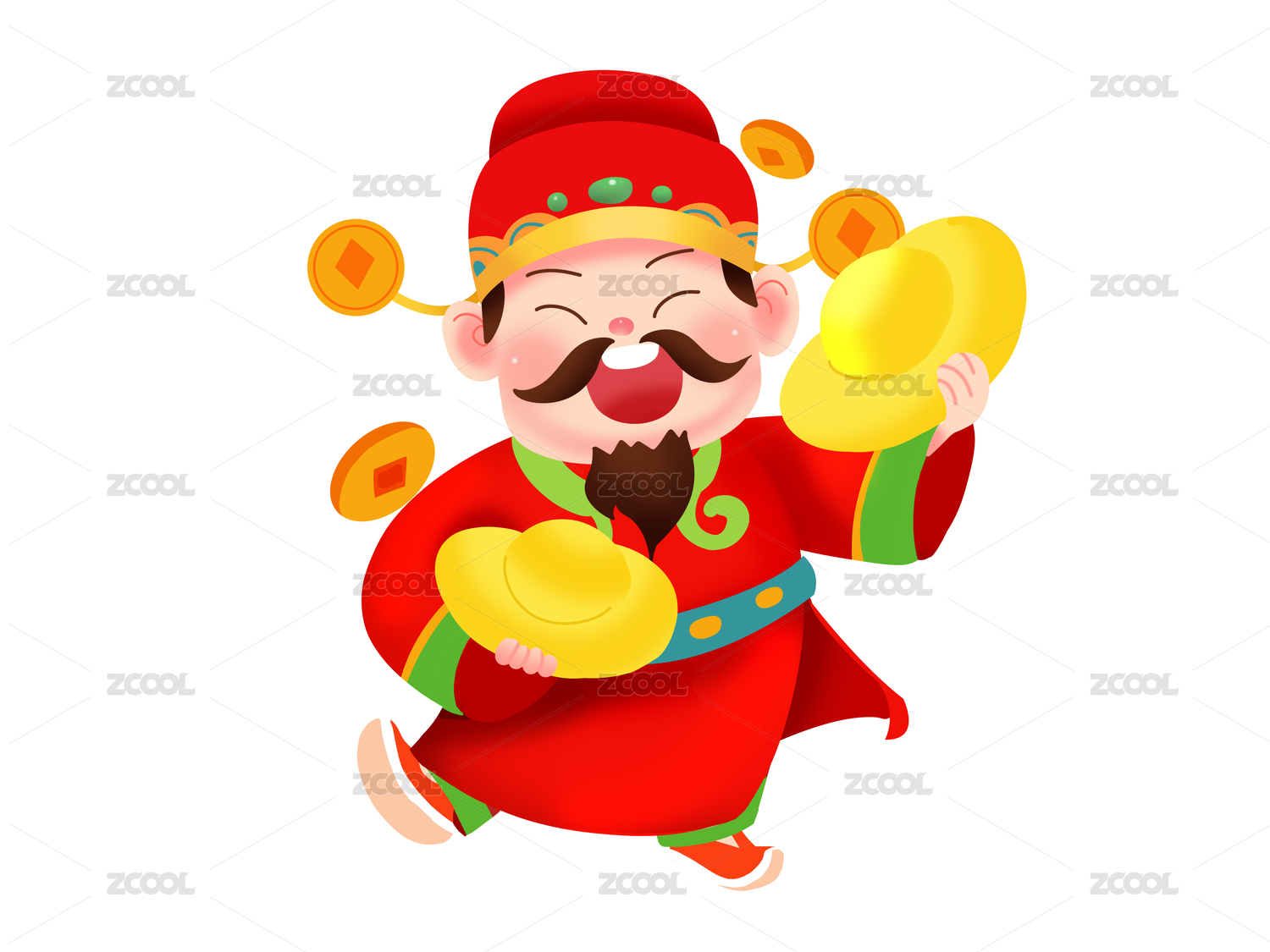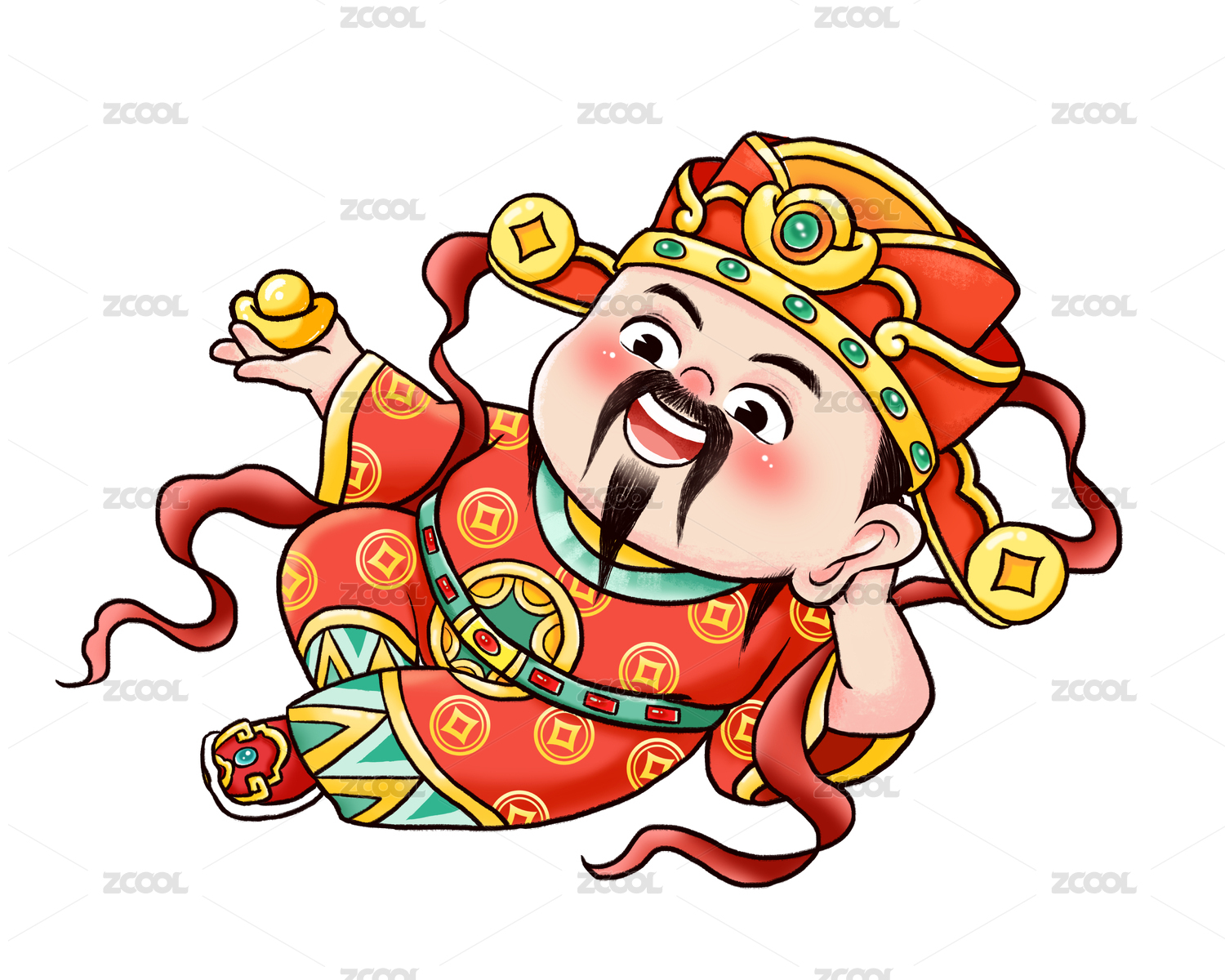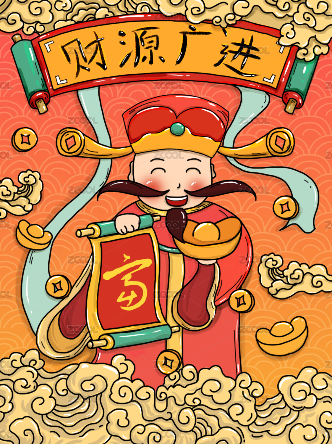 红色喜庆手绘国潮财神爷祝贺新春快乐插画