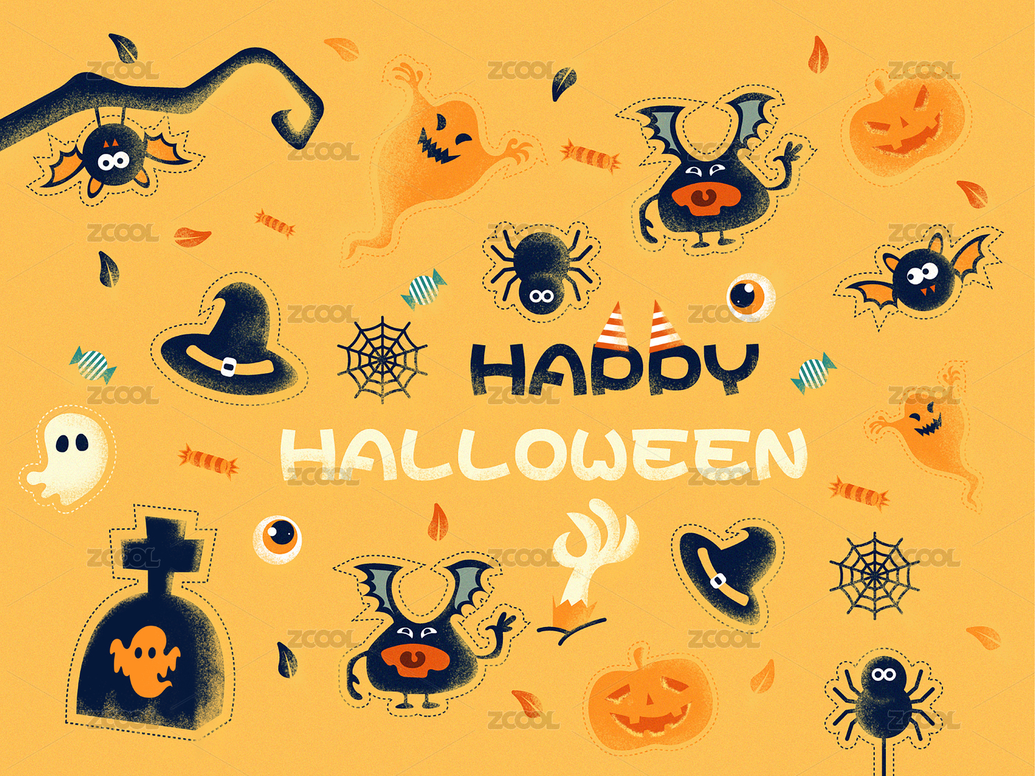 卡通手绘万圣节鬼怪巫婆闪屏插画背景