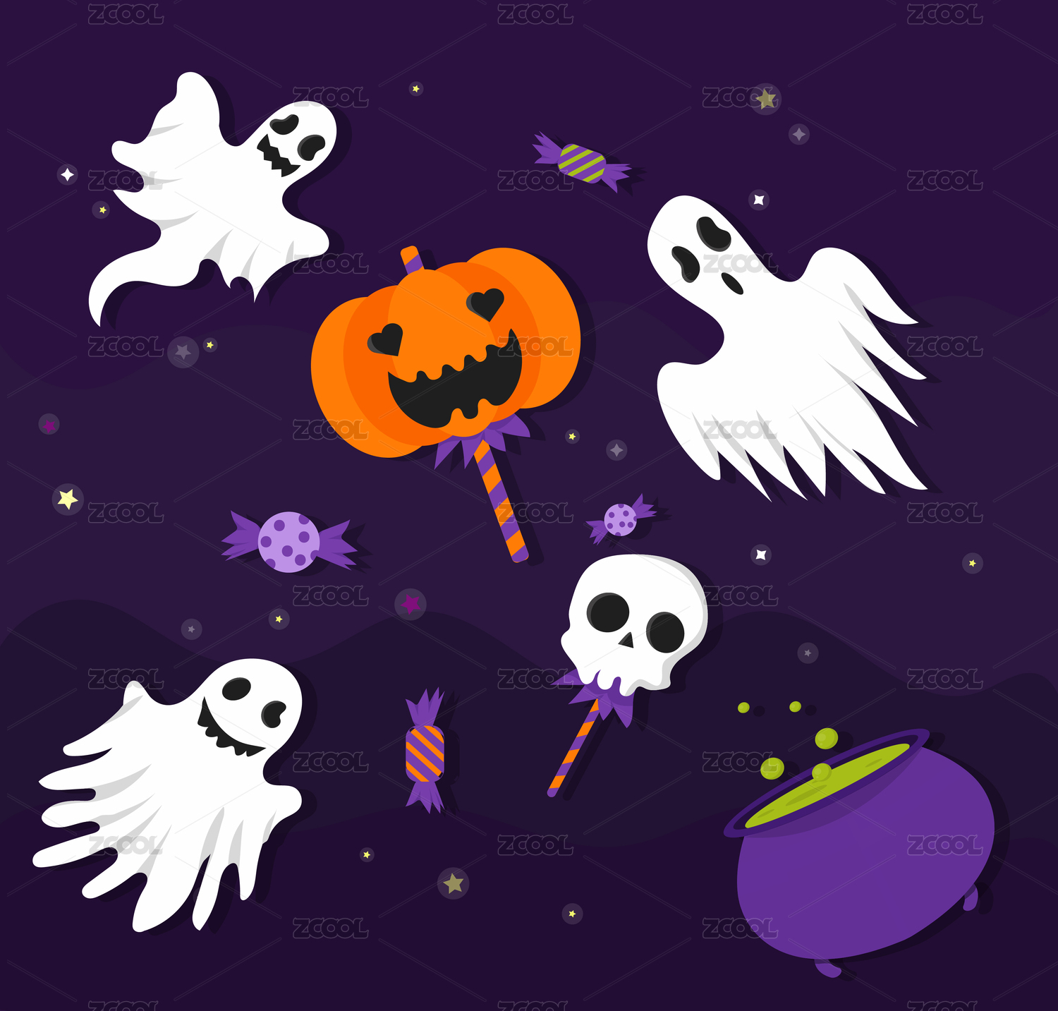 万圣节女巫鬼怪南瓜骷髅糖果留白插画