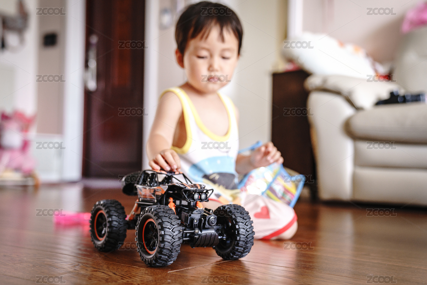 宝宝在家里的木地板上玩着玩具遥控汽车