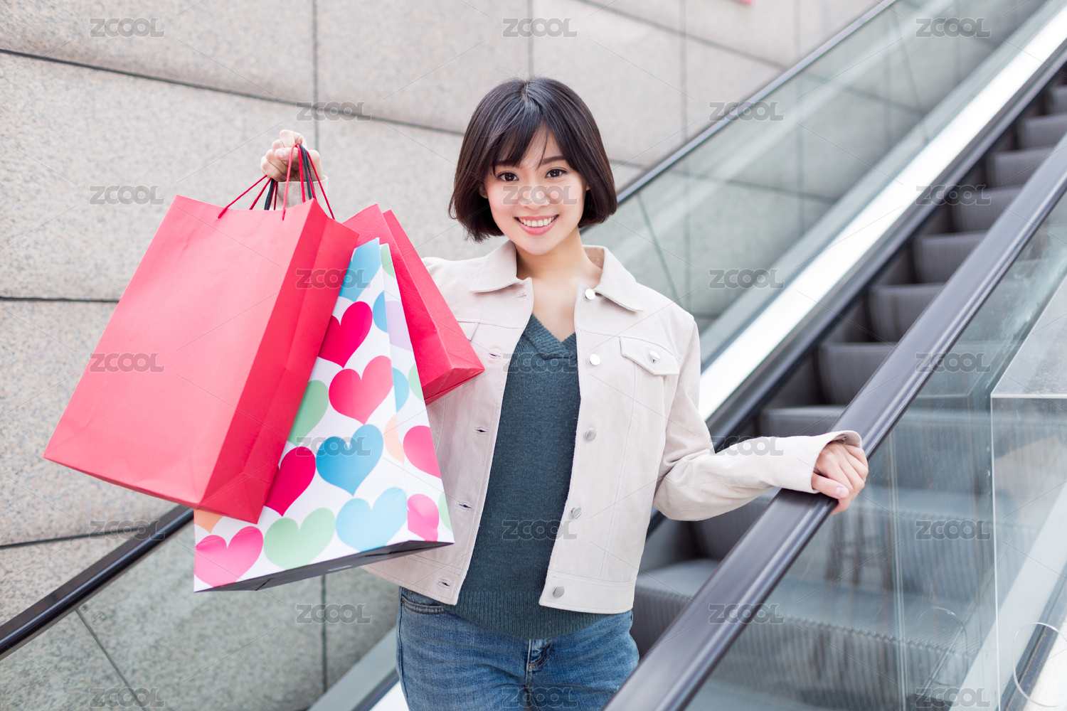 提着购物袋开心的年轻女孩购物途中