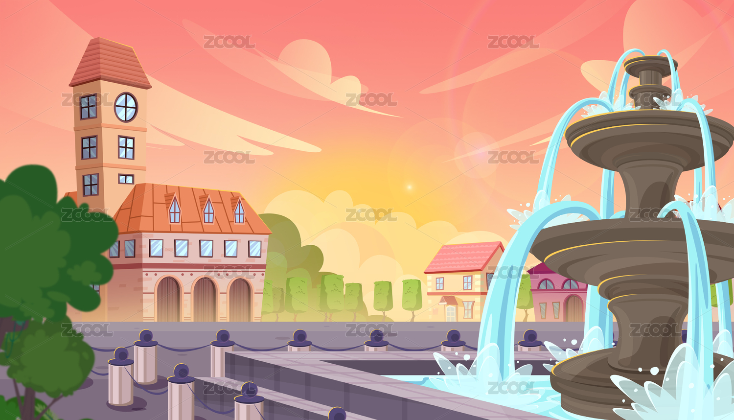 儿插喷泉广场场景黄昏室外矢量