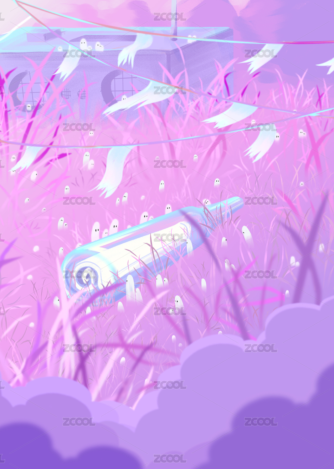 儿插紫色渐变梦幻小人国插画背景