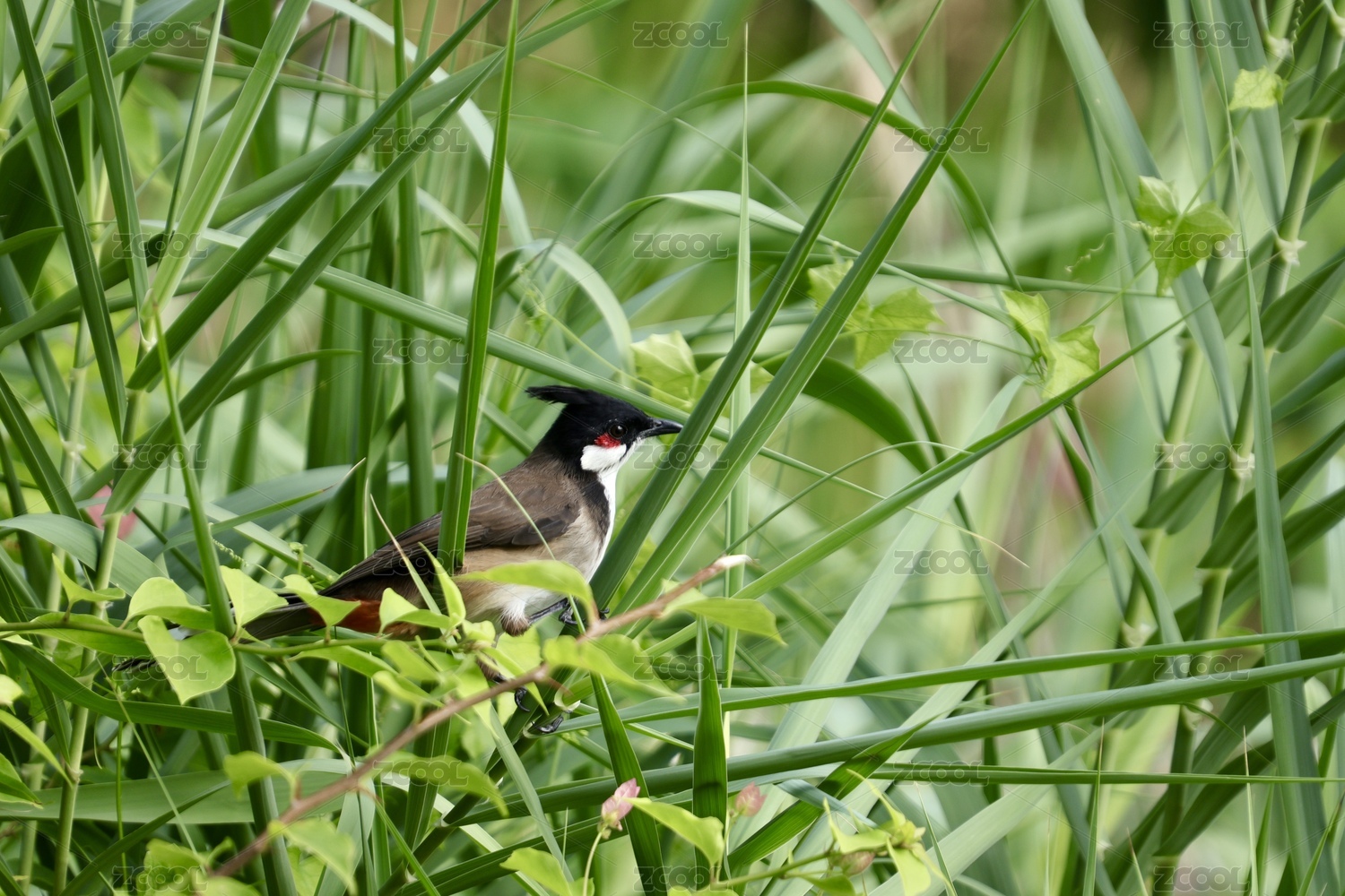 一只红耳鹎鸟站立在再力花上啄食花瓣
