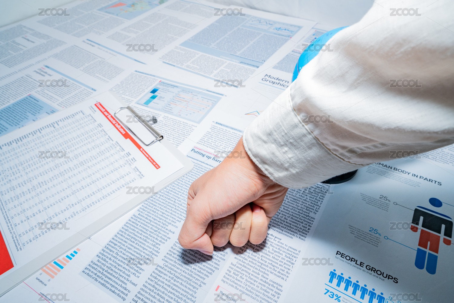 金融人士老板看着手里报表图表报告的业绩下降下跌愤怒的握拳砸桌子