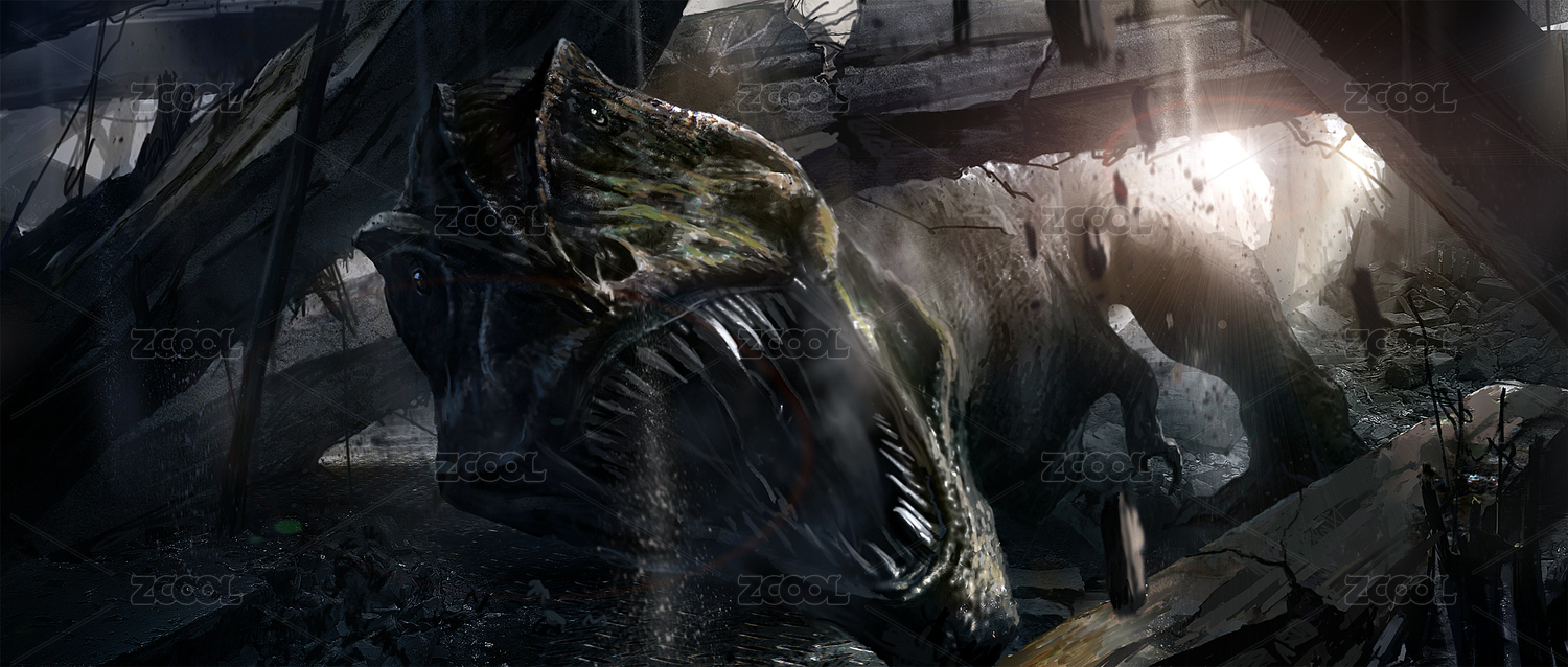 恐龙被塌掉的建筑物砸中,数字绘画。