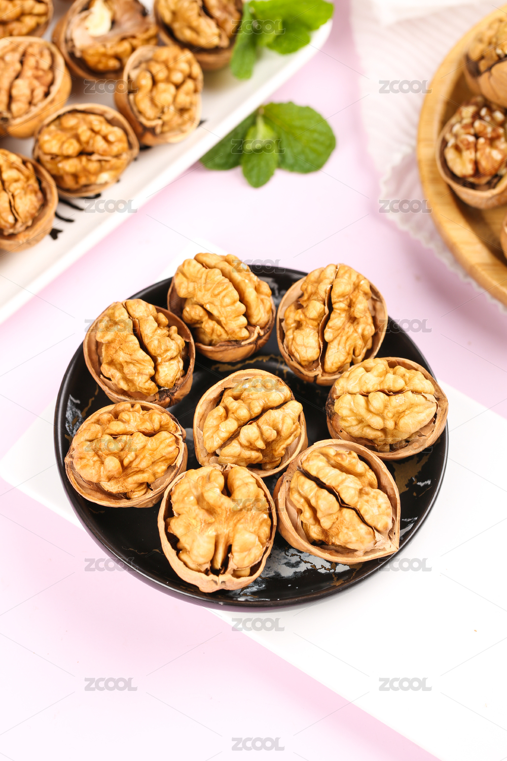 粉底上放着一盘新疆阿克苏纸皮核桃