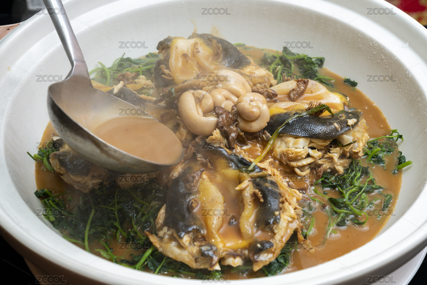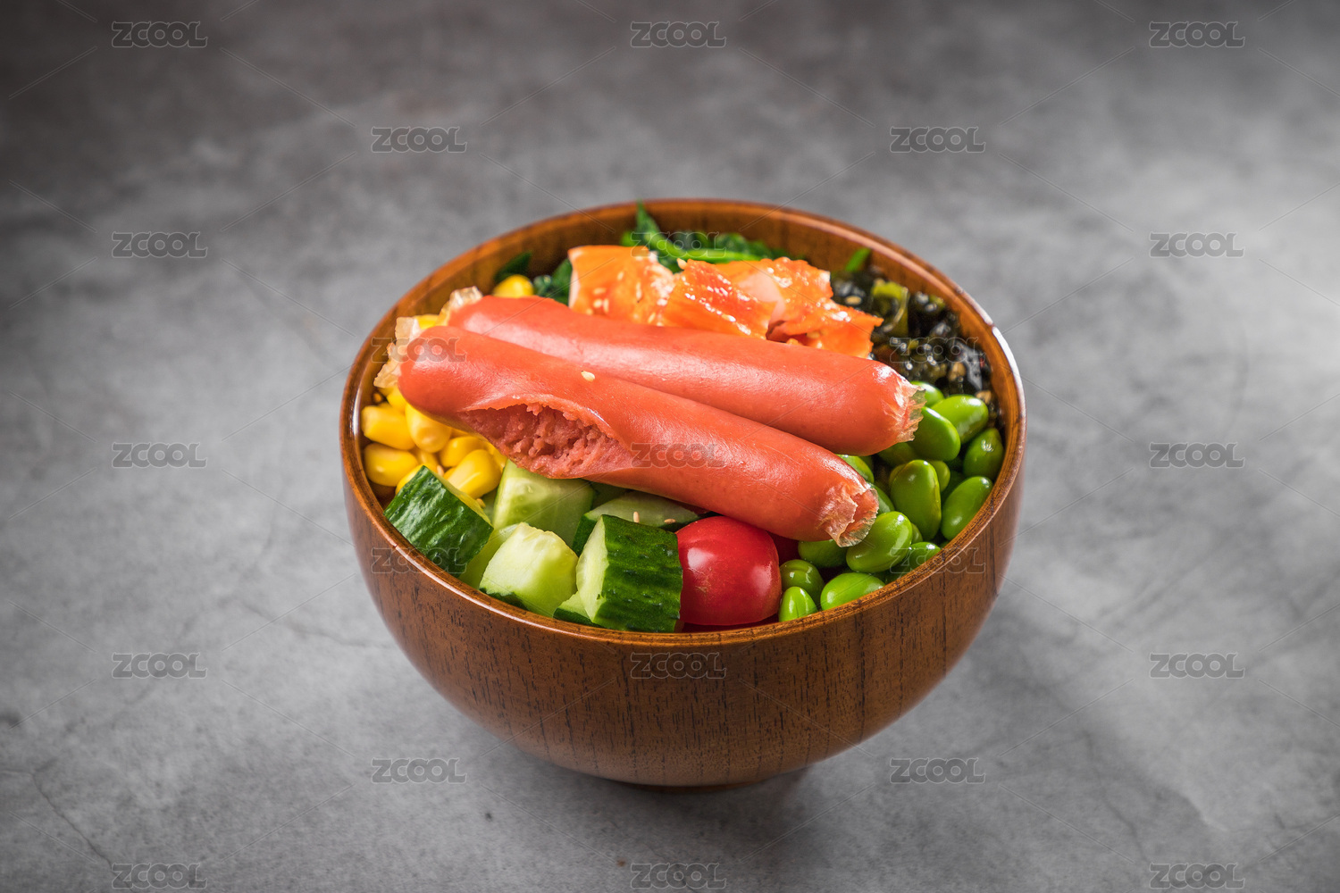 暗色水泥纹桌面上放着一碗香肠蟹棒肉饭套餐