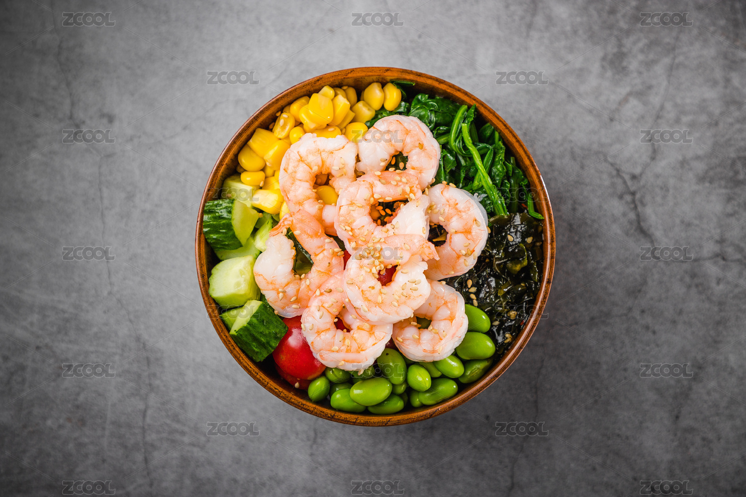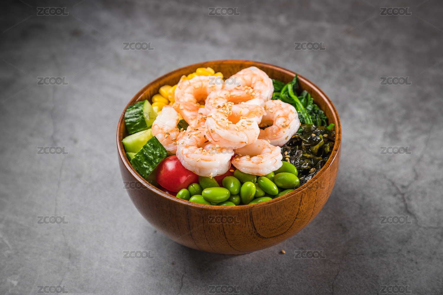 暗色水泥纹桌面上放着一碗虾仁米饭套餐