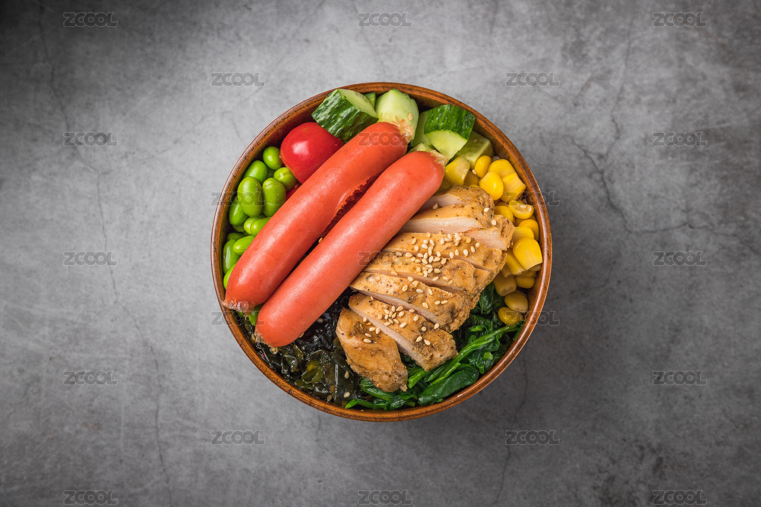 暗色水泥纹桌面上放着一碗香肠鸡胸肉饭