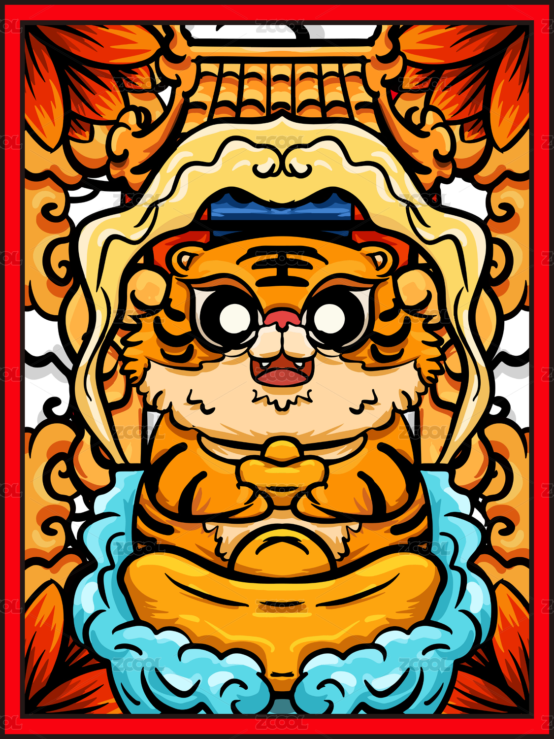 坐在莲花上的开心的小老虎抱大锦鲤