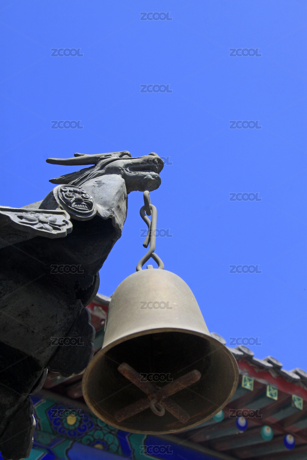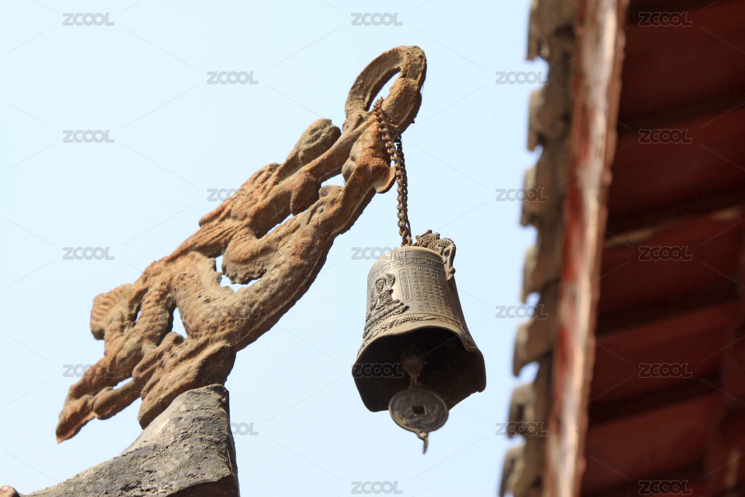 古建筑屋檐上的铜铃与龙雕