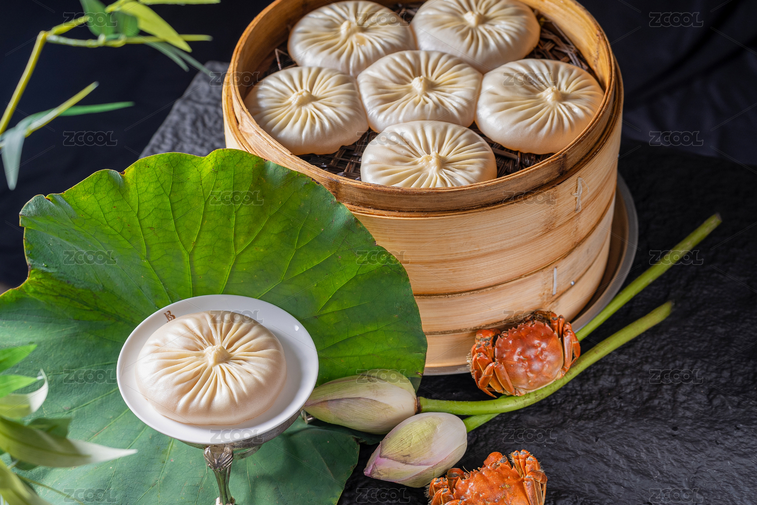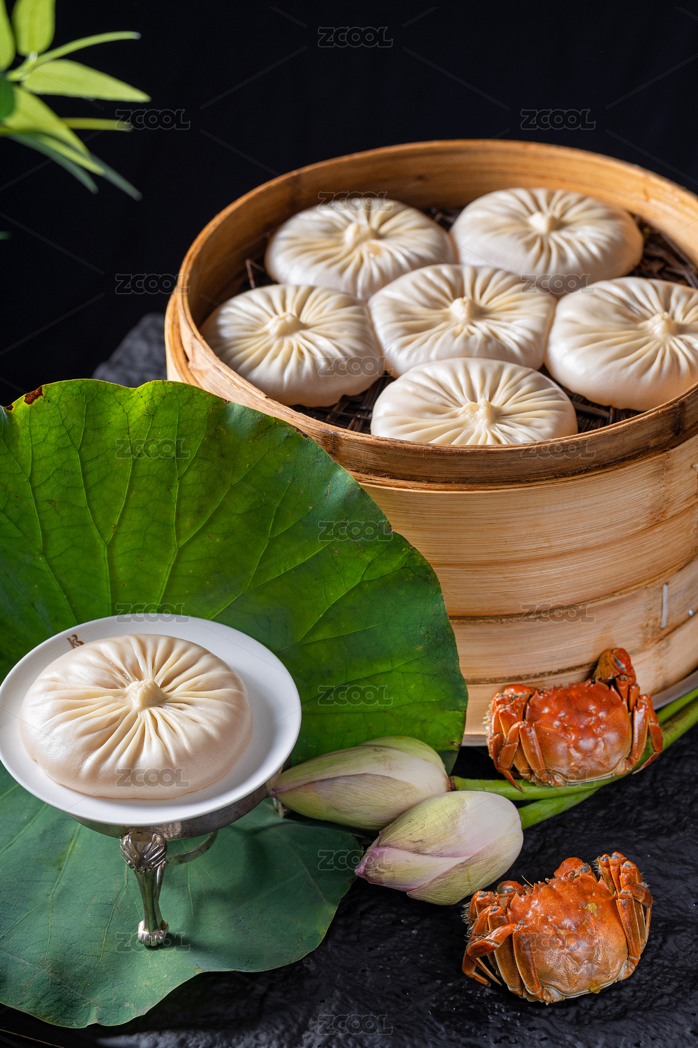 一笼中国传统小吃蟹粉灌汤包的特写