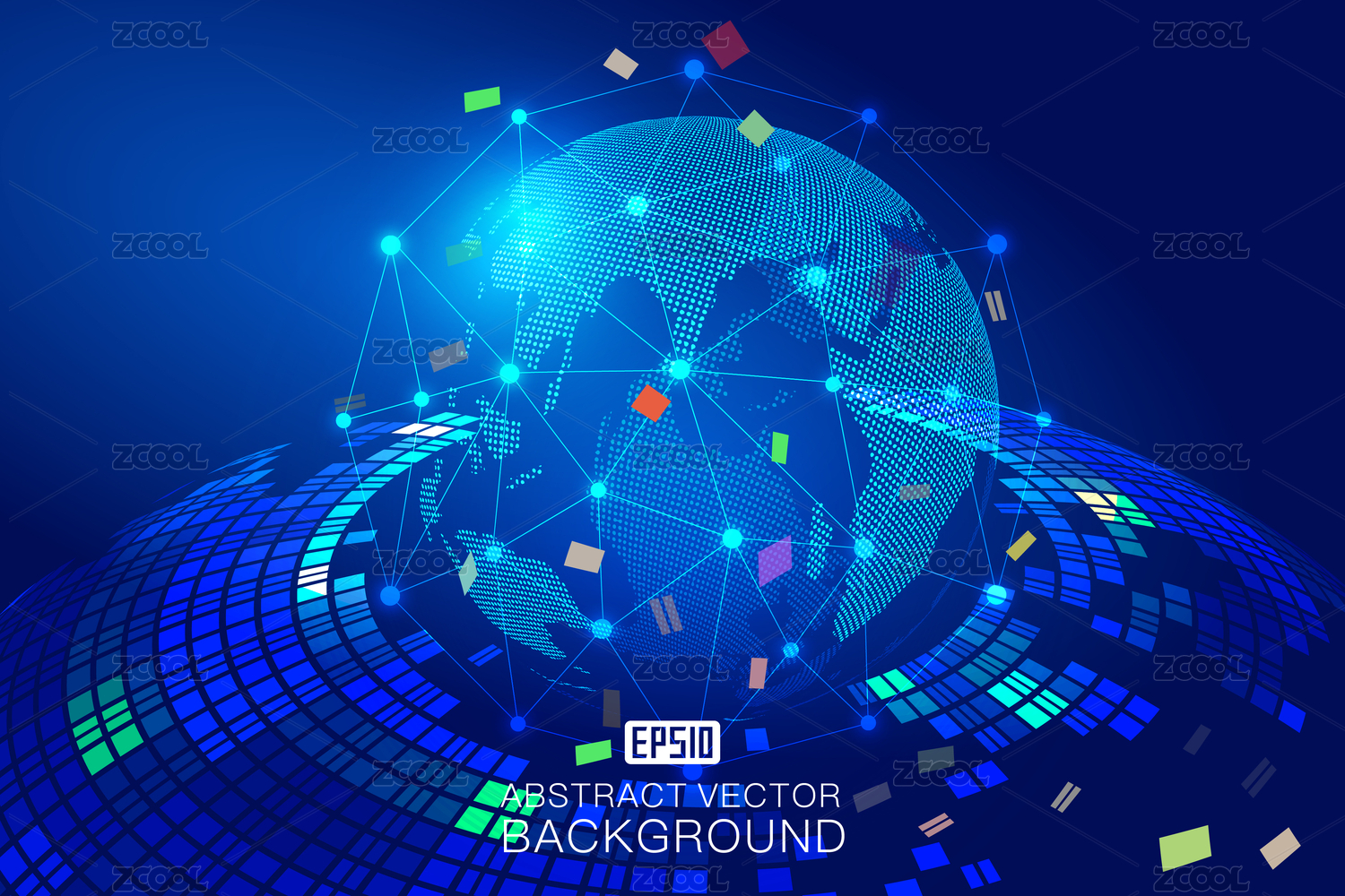蓝色的漩涡与点线链接地球组成发光科技背景,蔚蓝科技效果的矢量元素