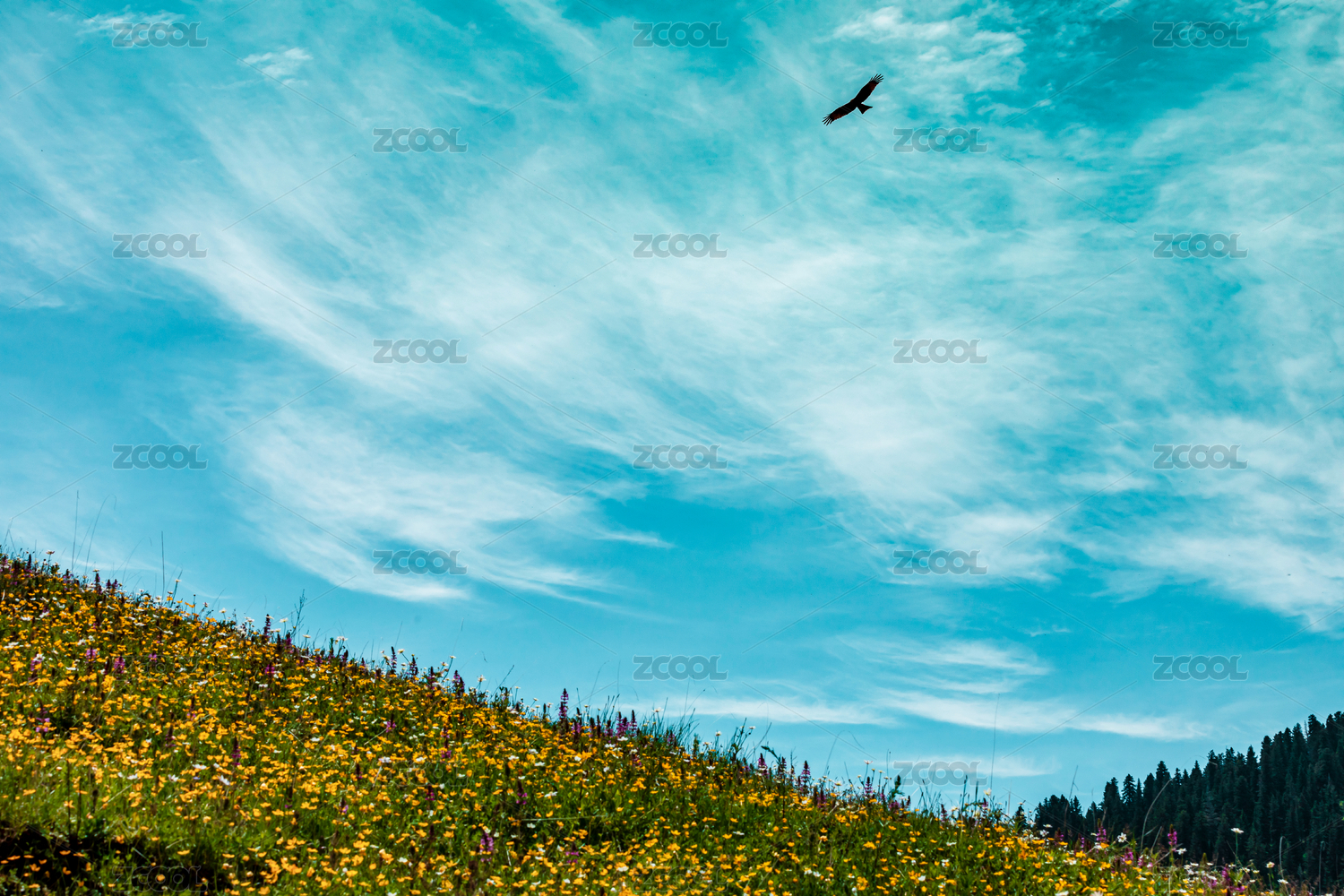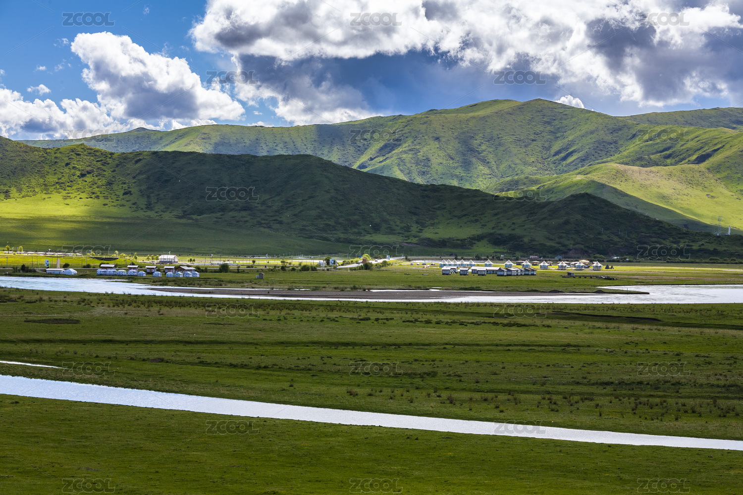 四川阿坝红原月亮湾的草原湿地和牦牛