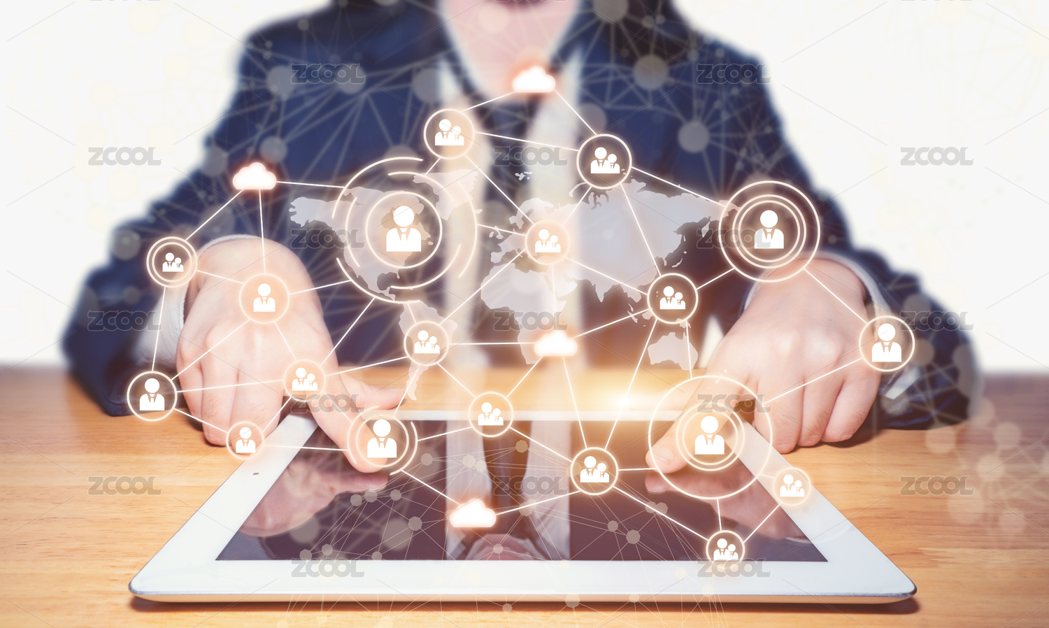 一个商务人士使用平板进行互联网数据云存储及数据处理分析概念