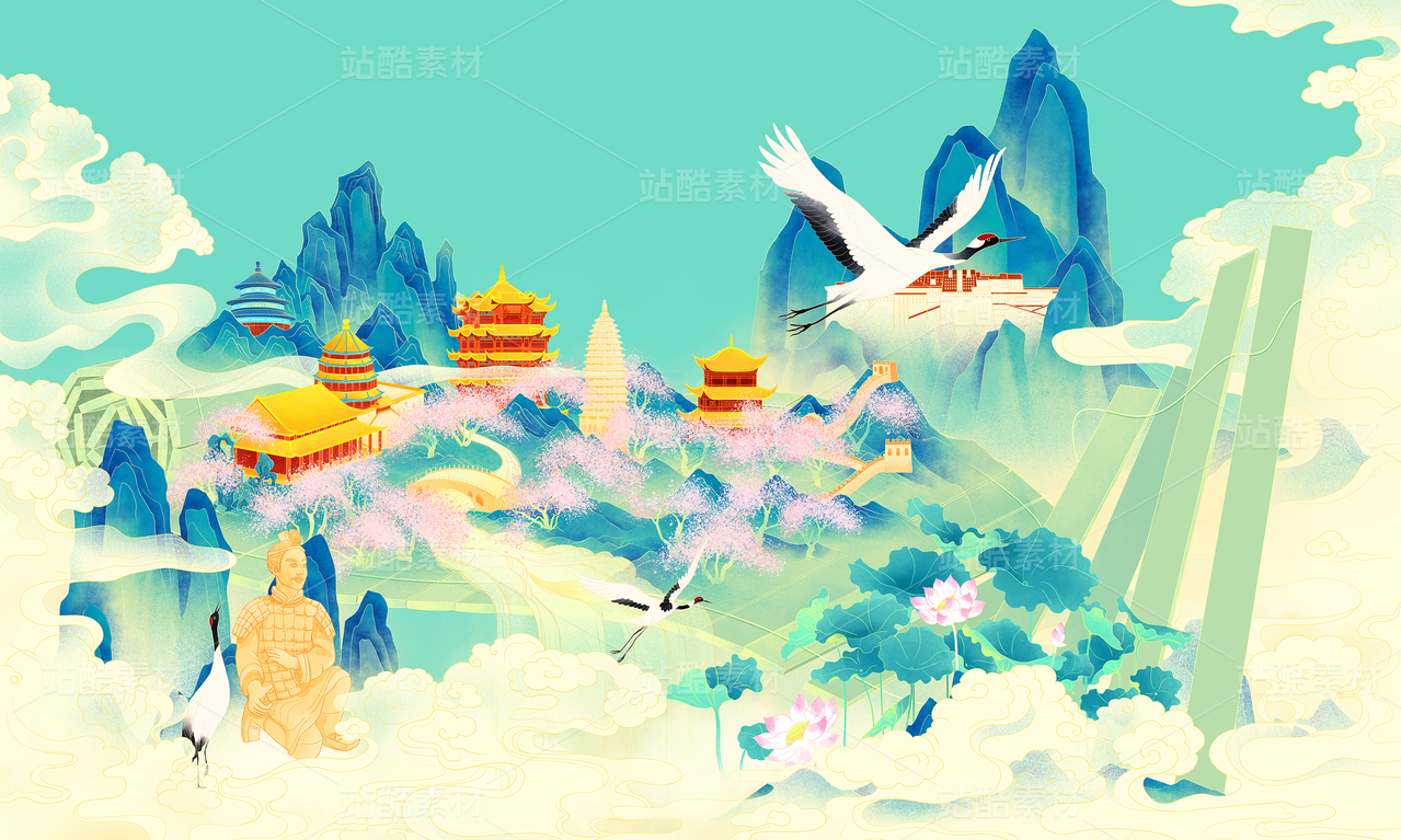 中国古代竹简上建筑青山祥云桃花白鹤国潮插画