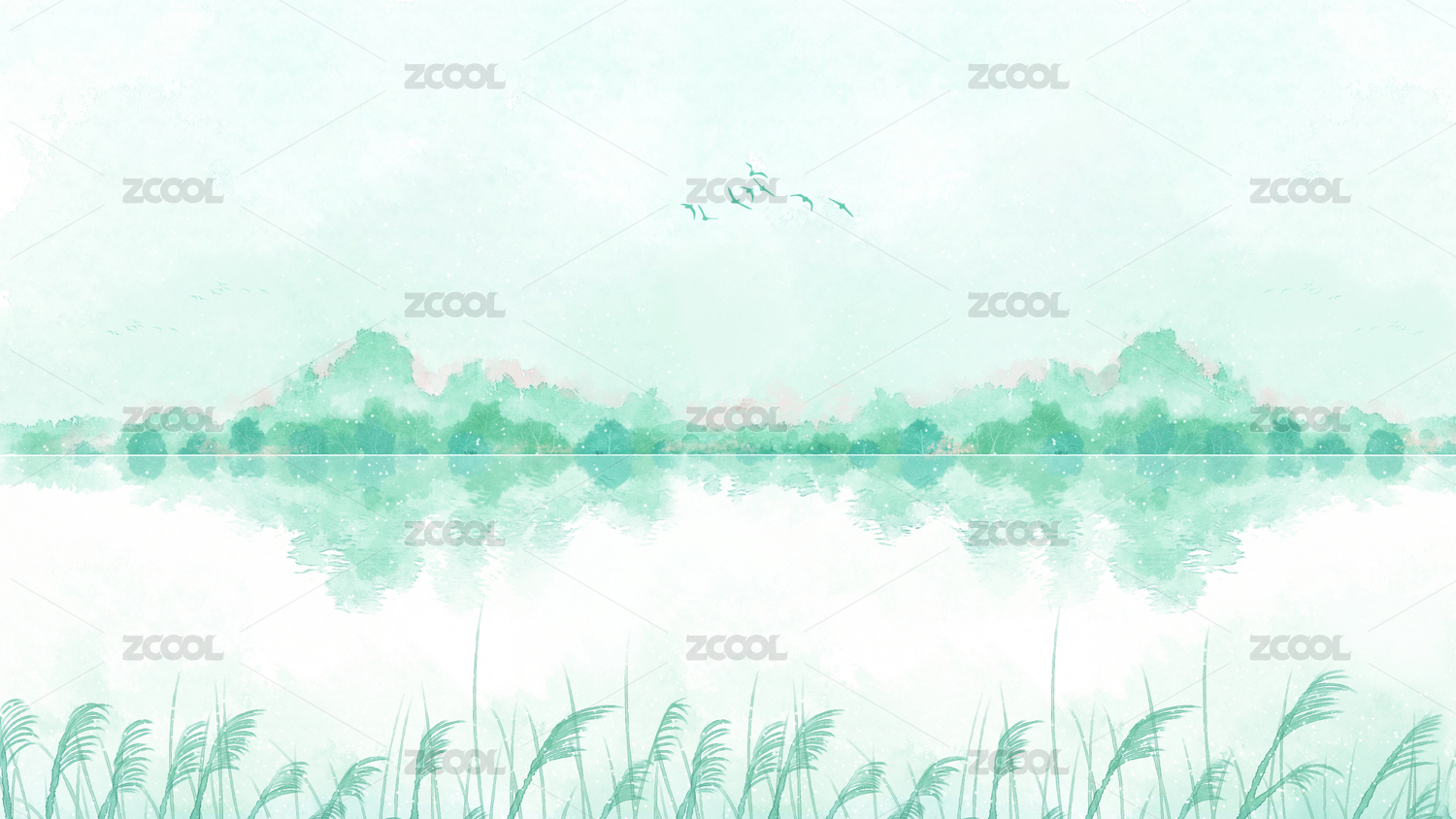 小清新水彩插画青山绿水芦苇荡
