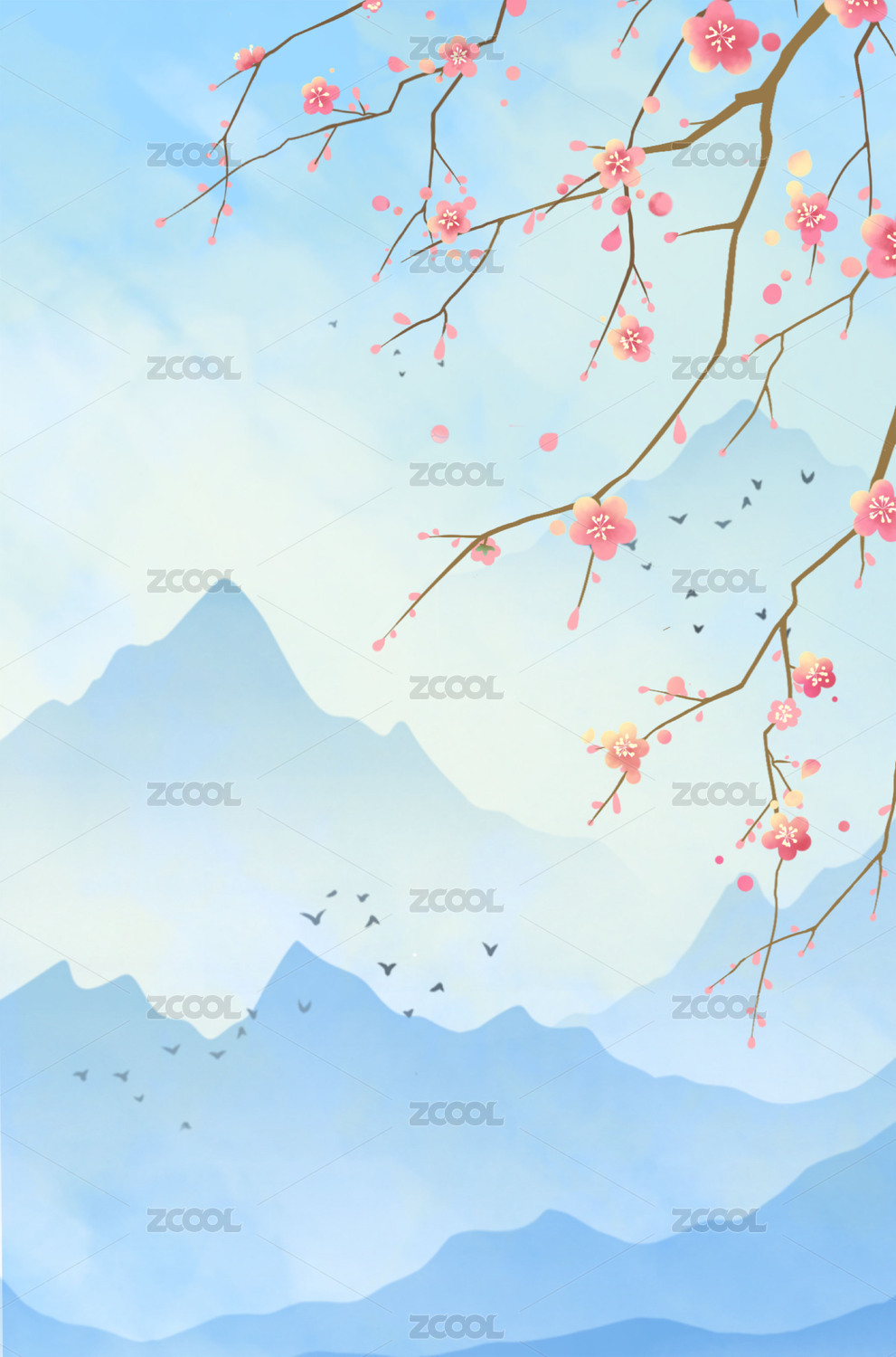 水彩风青山绿水飞鸟插画