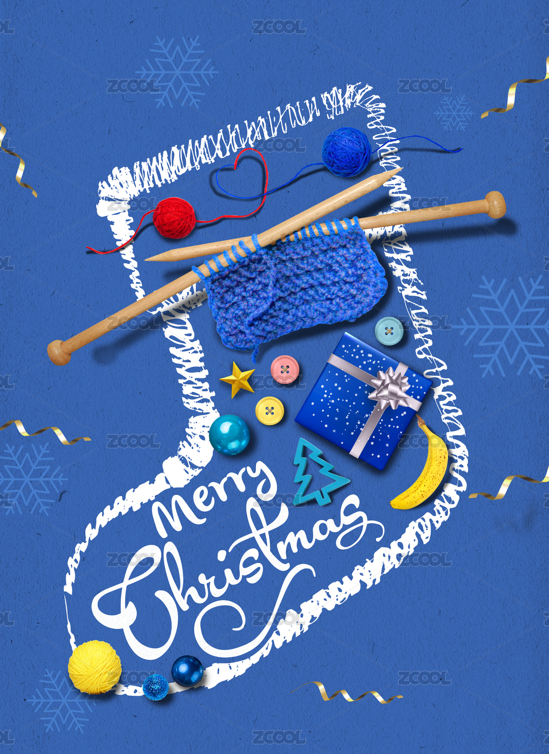蔚蓝色调圣诞袜红色蓝色毛线球毛衣针纽扣蓝色礼物盒香蕉摆拼,圣诞节概念海报