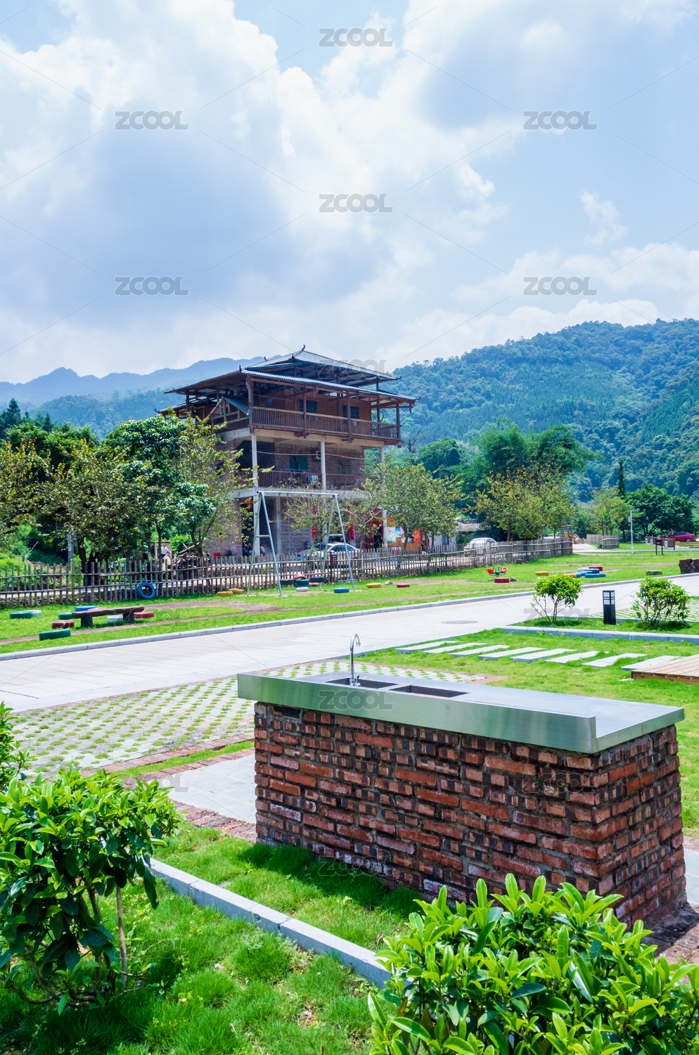 景区里木楼道路和自来水池