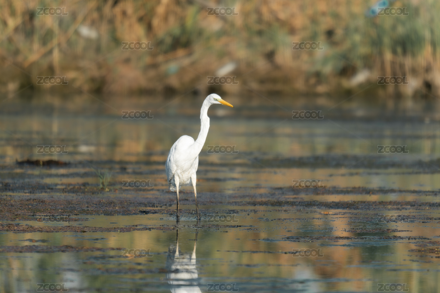 一只大白鹭鸟游荡驻守在浅水沼泽上寻觅食物