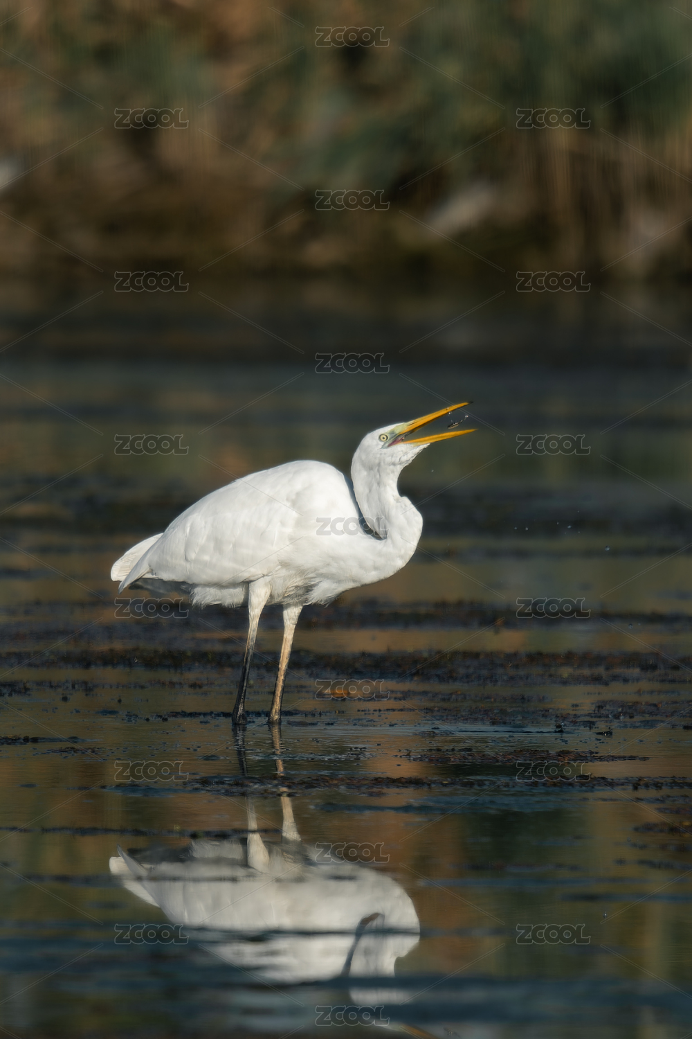 站在湖边的大白鹭(Great White Egret)正在进食