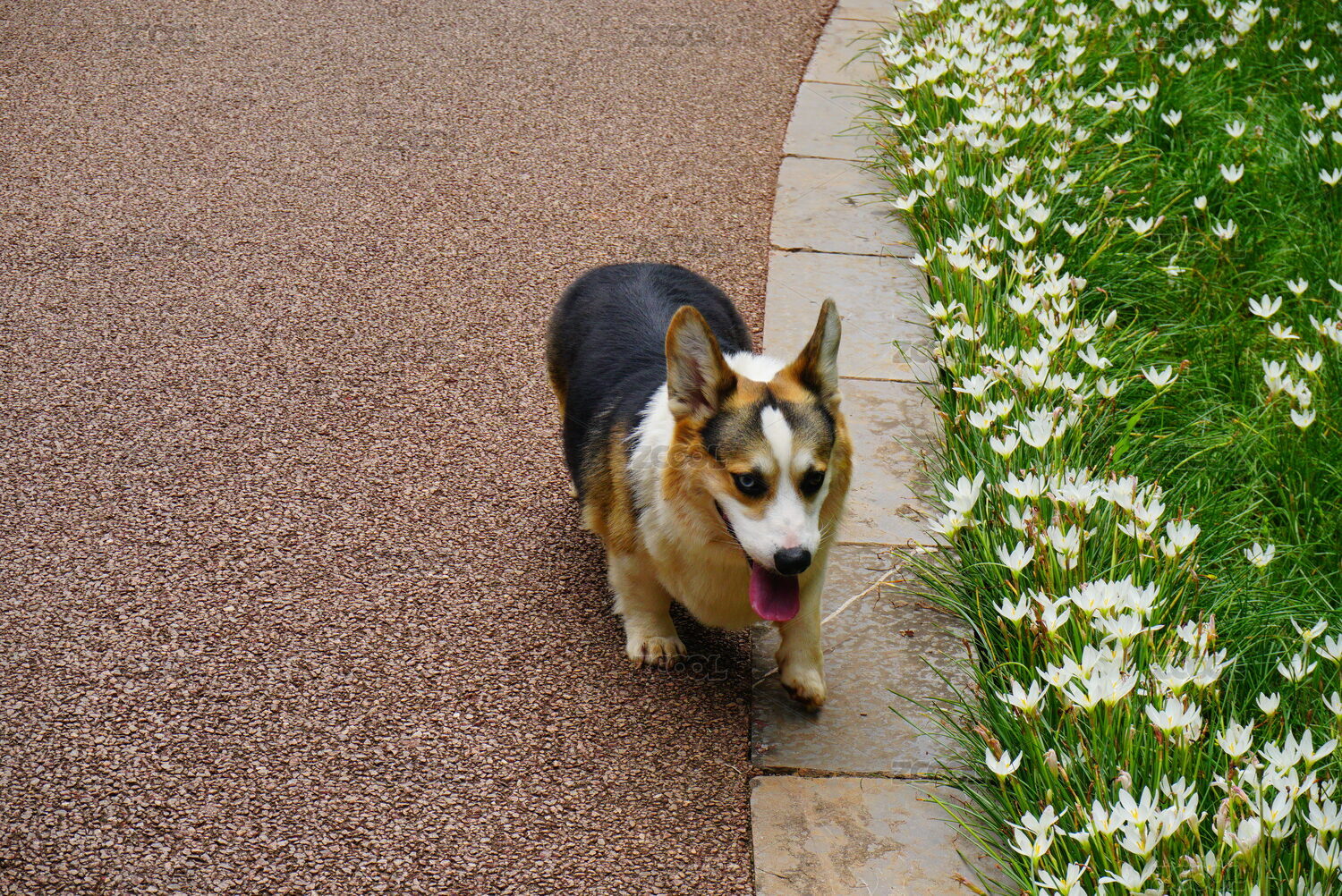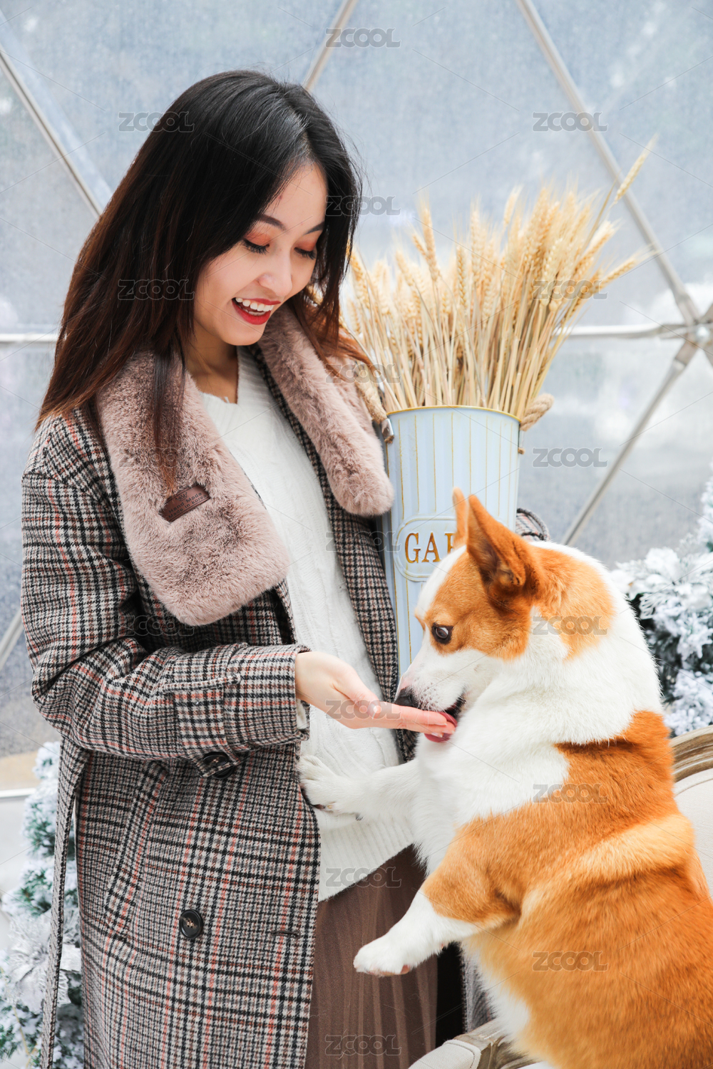 圣诞节一名年轻女性在跟柯基宠物小狗玩耍