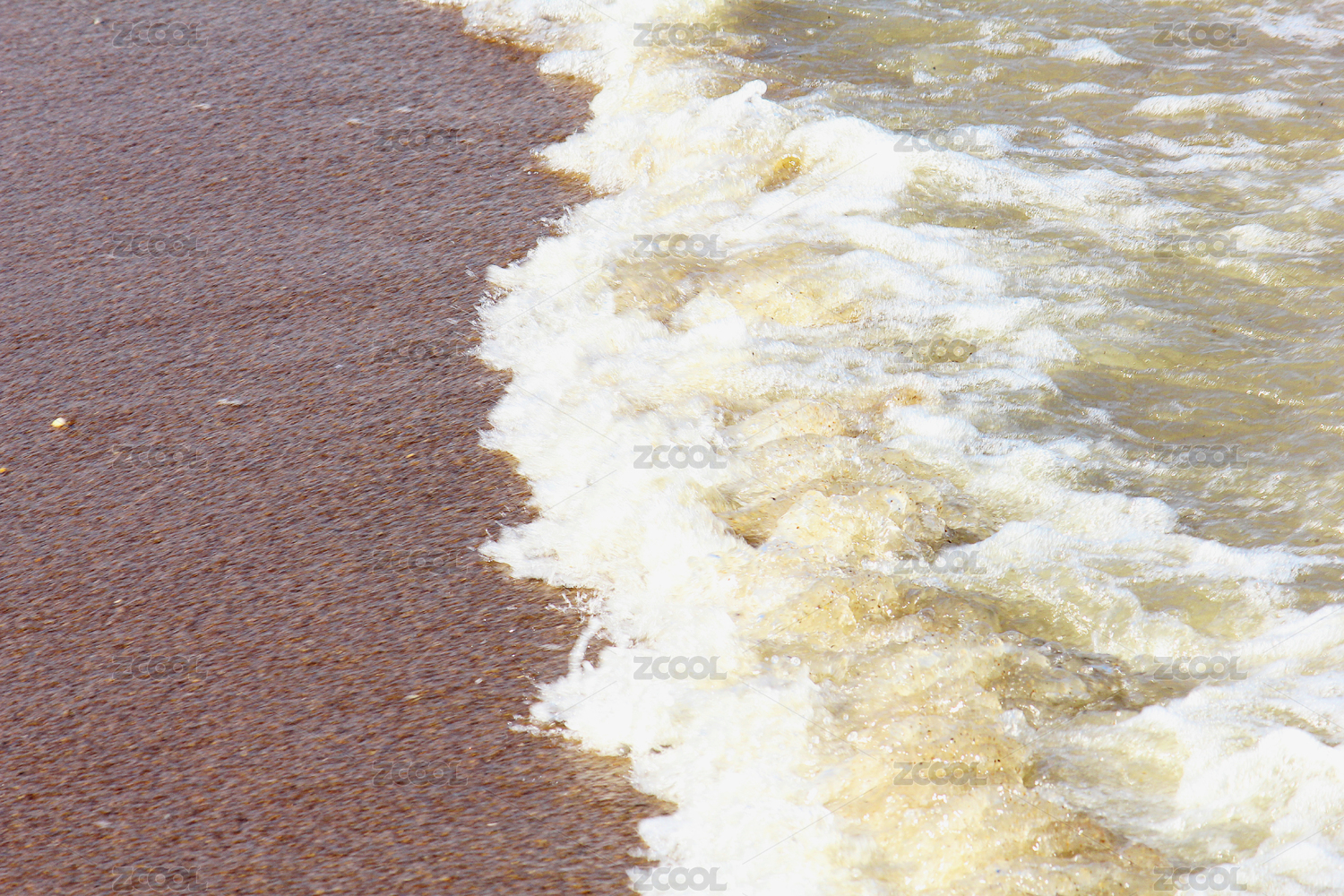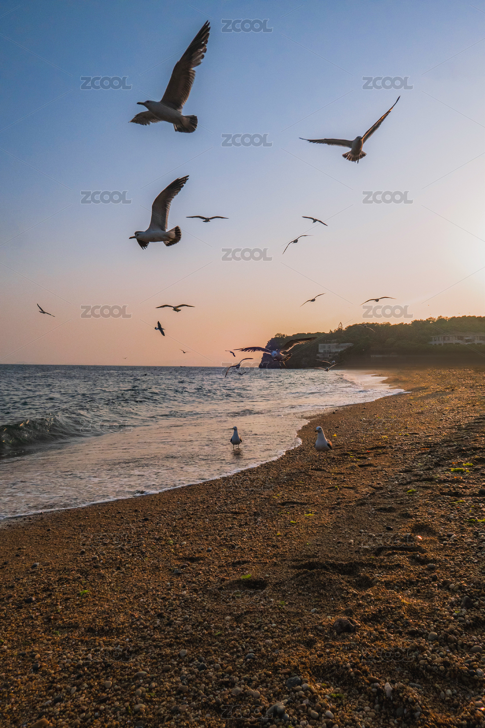 夕阳照射在海滩上海浪冲刷海岸天空海鸥飞翔