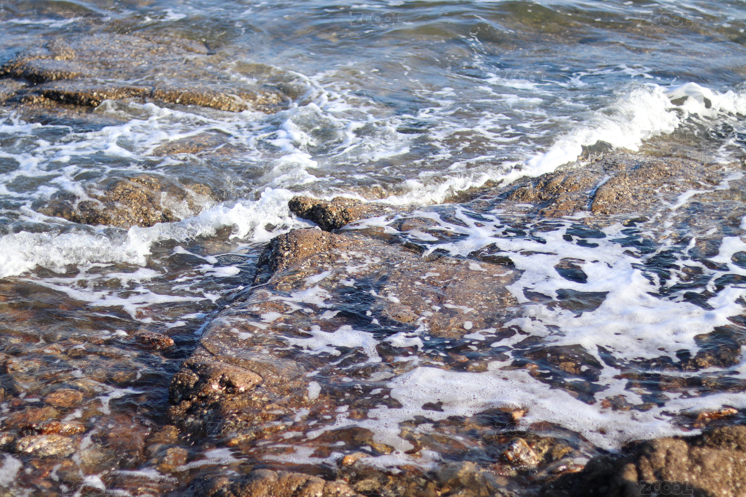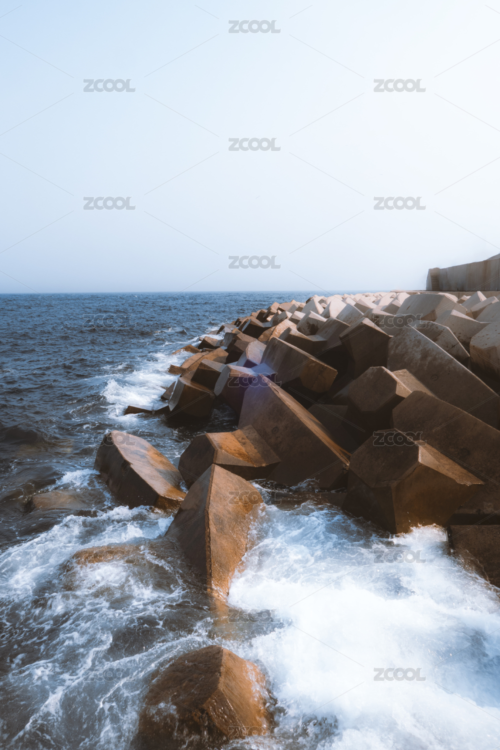 大连菱角湾海浪冲刷岸边的防波石竖图